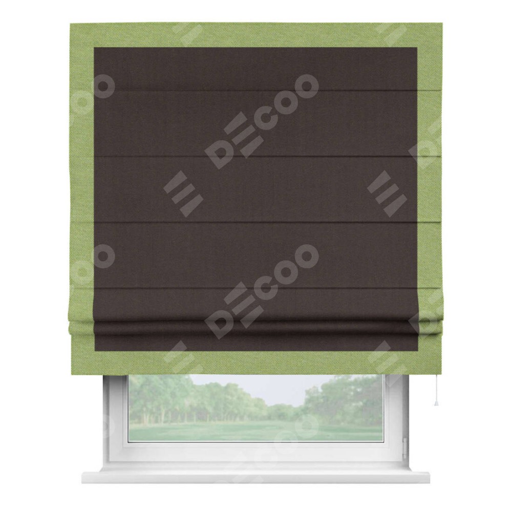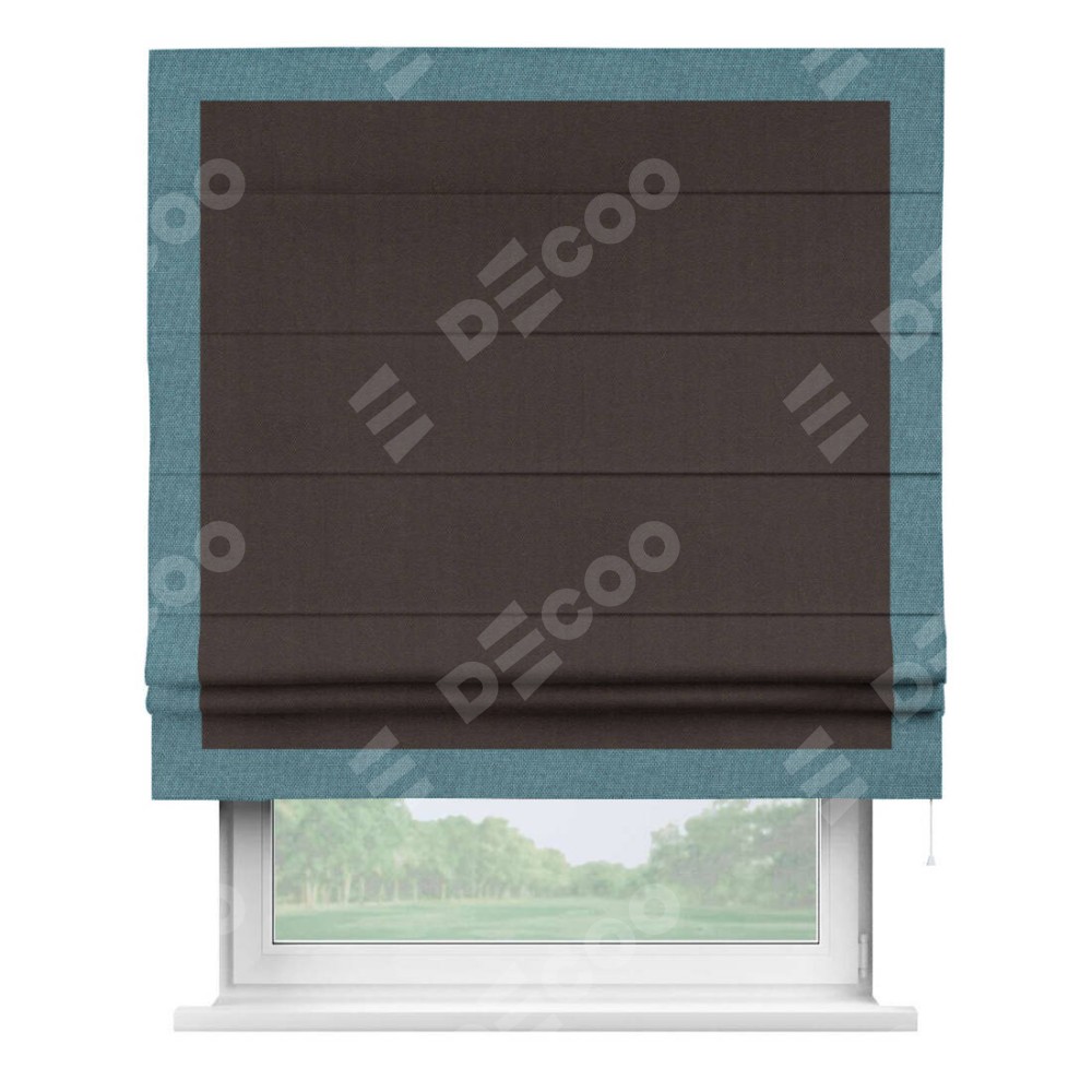 Римская штора пошита из ткани лён димаут венге, артикул: 91001, с отделкой кантом «Чесс» отличается своей уникальной деталью — наличием канта не только по бокам и снизу, но и сверху по всем краям шторы. Это придает шторе особенно аккуратный и завершенный вид, делая акцент на границах и форме шторы. Отделка кантом по всему периметру шторы усиливает её декоративные качества и подчеркивает строгую геометрию, что может быть особенно актуально для современных и минималистичных интерьеров.