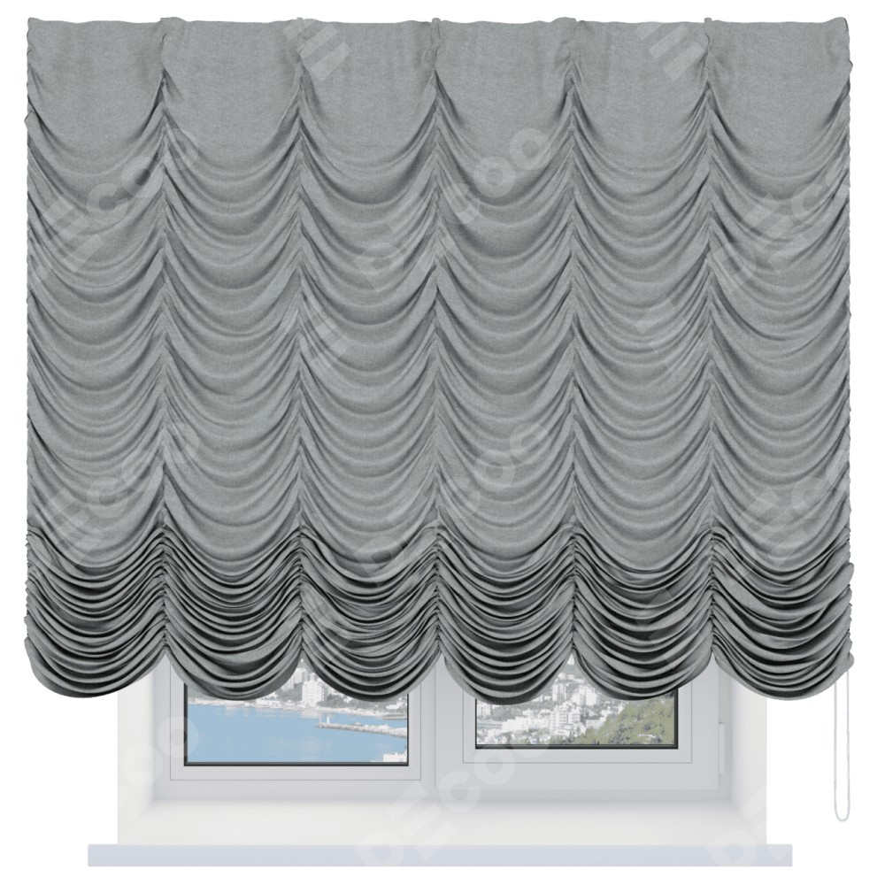 Французская штора производителя «Cortin», используется для проёма, пошита из ткани лён кашемир серый, артикул ткани 17208. Имеет универсальный механизм и подходит для монтажа: на потолок и на стену.