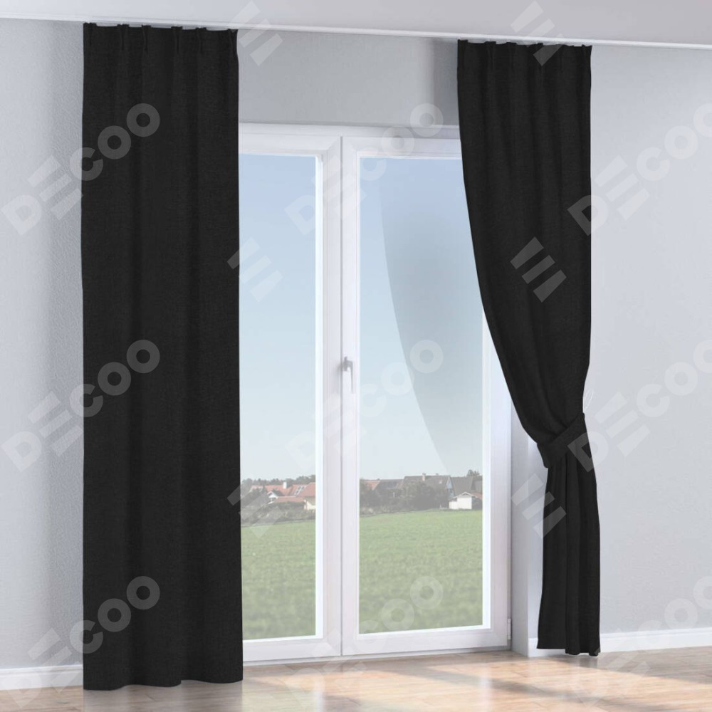 Комплект прямых штор, от производителя «Cortin», пошиты из ткани лён черный, артикул ткани 140815. С изнаночной стороны в верхней части штор пристрачивается шторная лента с декоративными складками «Кустик». Для создания элегантных складок рекомендуемый коэффициент 1:2 (на 100 см. ширины проёма 200 см. ширины ткани). Важно! Ширина штор указана без учёта коэффициента сборки!