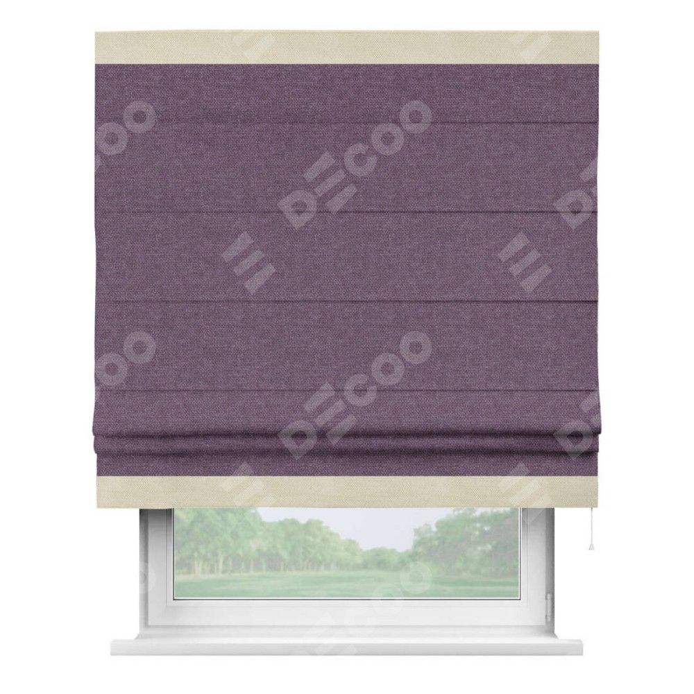 Римская штора производителя «Cortin», используется для проёма, пошита из ткани лён димаут брусника, артикул 16. Отделка шторы кантом «Горизонт», ткань для канта используется из льна димаут разной расцветки на выбор. Имеет универсальный механизм и подходит для монтажа: на потолок, на стену и в нишу.