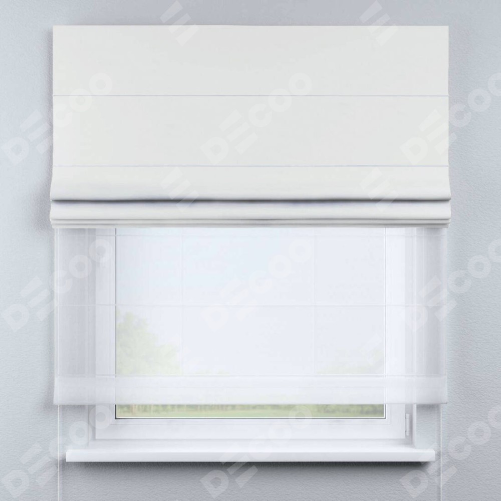 Двойная римская штора «День-ночь» от производителя Cortin предназначена для использования в проёмах. Эта штора уникальна тем, что состоит из двух полотен. На лицевой стороне находится лён димаут молочный (артикул: 29), обеспечивающий эффективное затемнение. В комплект также входит вторая ткань — легкий белый тюль (артикул: V-01), который добавляет изящества и легкости оформлению окна. Кроме того, доступны и другие разновидности ткани тюль, выбор которых доступен по ссылке .