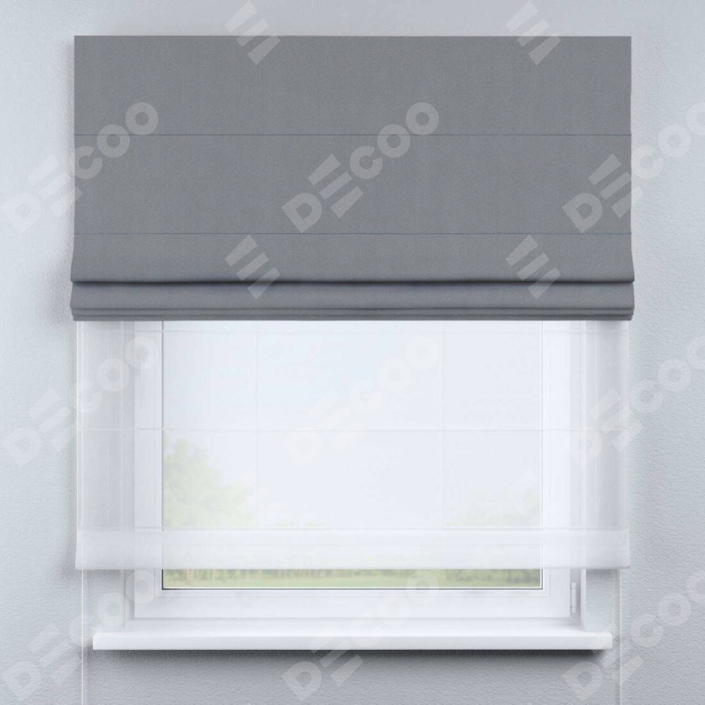 Двойная римская штора «День-ночь» от производителя Cortin предназначена для использования в проёмах. Эта штора уникальна тем, что состоит из двух полотен. На лицевой стороне находится однотонный блэкаут серый (артикул: 146436), обеспечивающий эффективное затемнение. В комплект также входит вторая ткань — легкий белый тюль (артикул: V-01), который добавляет изящества и легкости оформлению окна. Кроме того, доступны и другие разновидности ткани тюль, выбор которых доступен по ссылке .