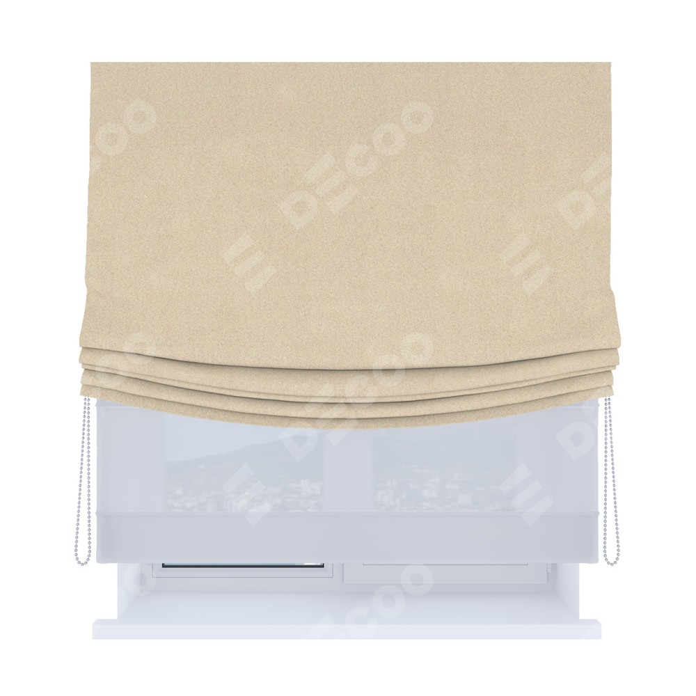 Двойная римская штора «День-ночь» от производителя Cortin предназначена для использования в проёмах. Эта штора уникальна тем, что состоит из двух полотен. На лицевой стороне находится однотонный блэкаут кофейно-бежевый (артикул: 91566−1), обеспечивающий эффективное затемнение. В комплект также входит вторая ткань — легкий белый тюль (артикул: V-01), который добавляет изящества и легкости оформлению окна. Кроме того, доступны и другие разновидности ткани тюль, выбор которых доступен по ссылке .