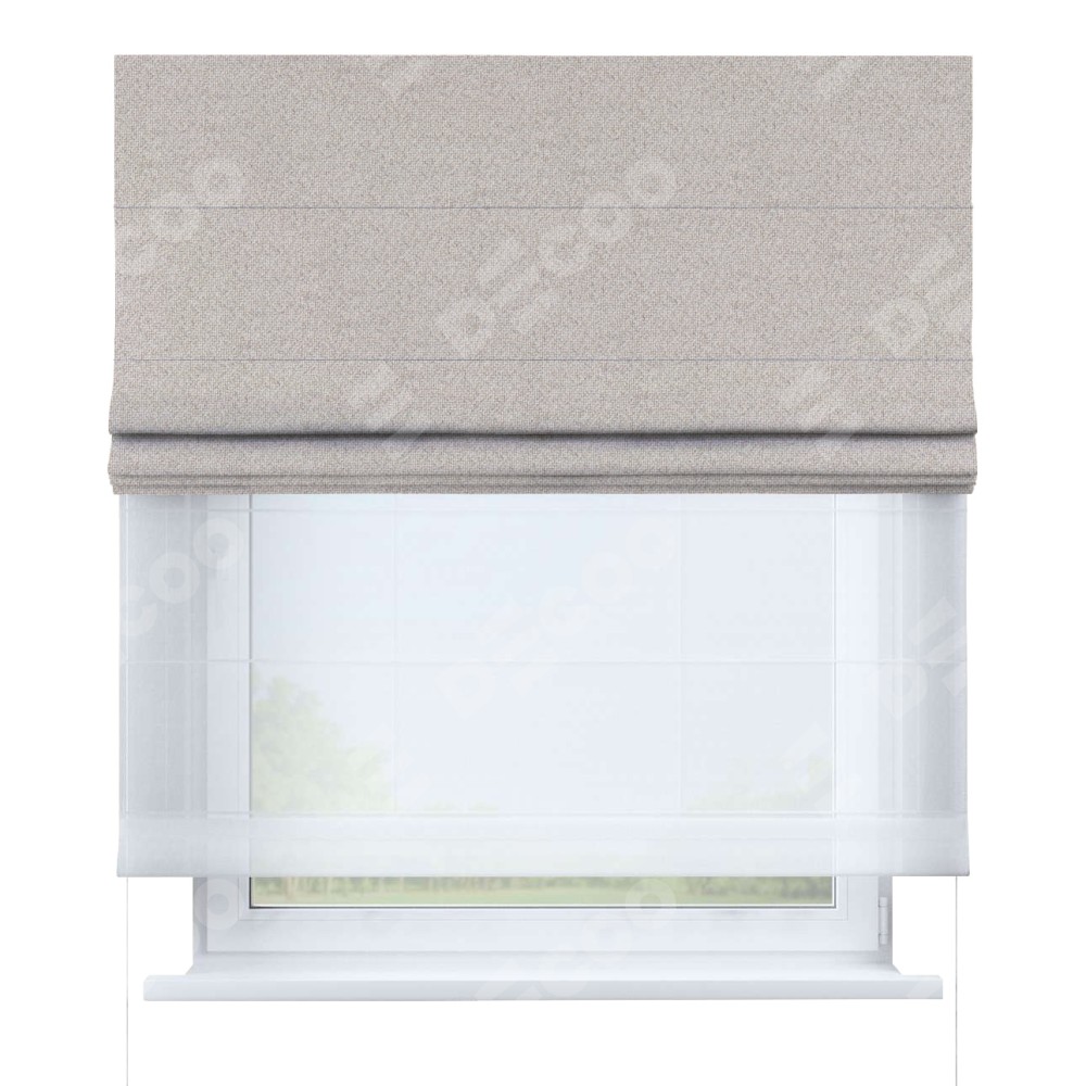 Двойная римская штора «День-ночь» от производителя Cortin предназначена для использования в проёмах. Эта штора уникальна тем, что состоит из двух полотен. На лицевой стороне находится лён димаут бежевый (артикул: 01), обеспечивающий эффективное затемнение. В комплект также входит вторая ткань — легкий белый тюль (артикул: V-01), который добавляет изящества и легкости оформлению окна. Кроме того, доступны и другие разновидности ткани тюль, выбор которых доступен по ссылке .