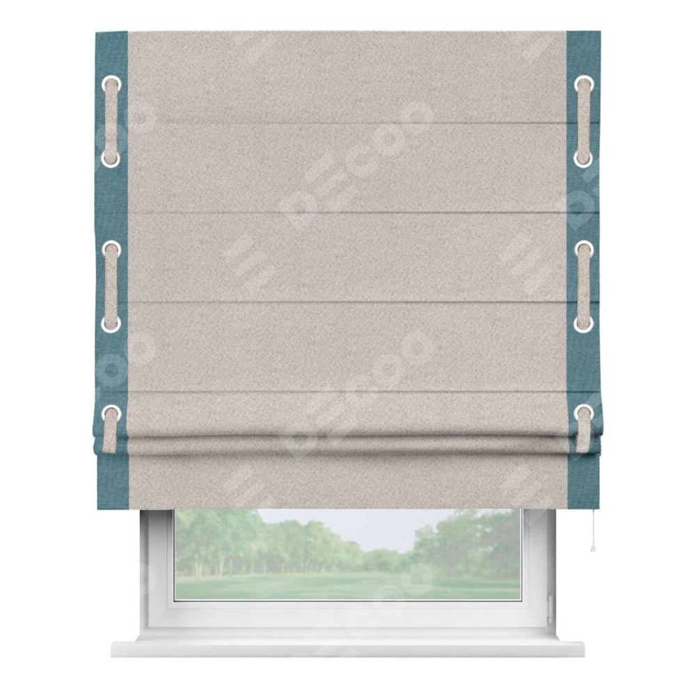Римская штора «Кортин» для проема, лён димаут бежевый с кантом Стрим Дуо (люверсы с пояском)