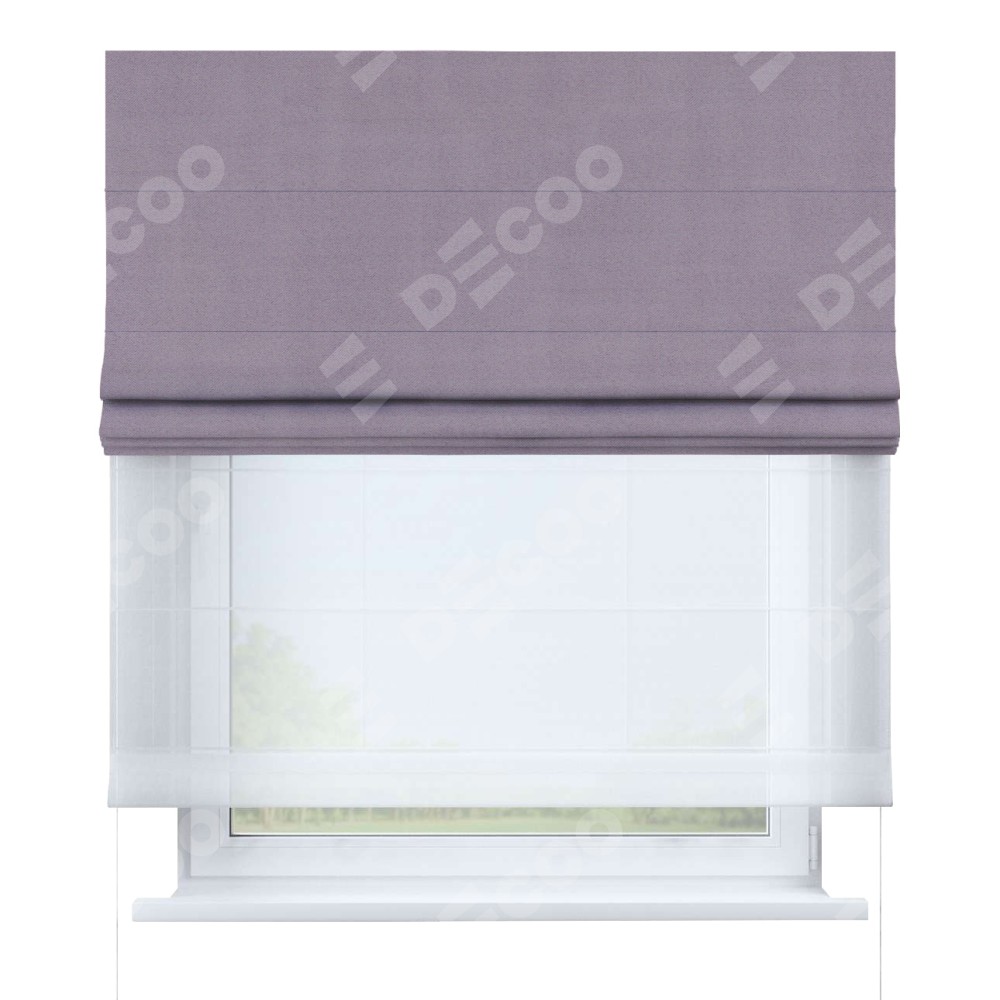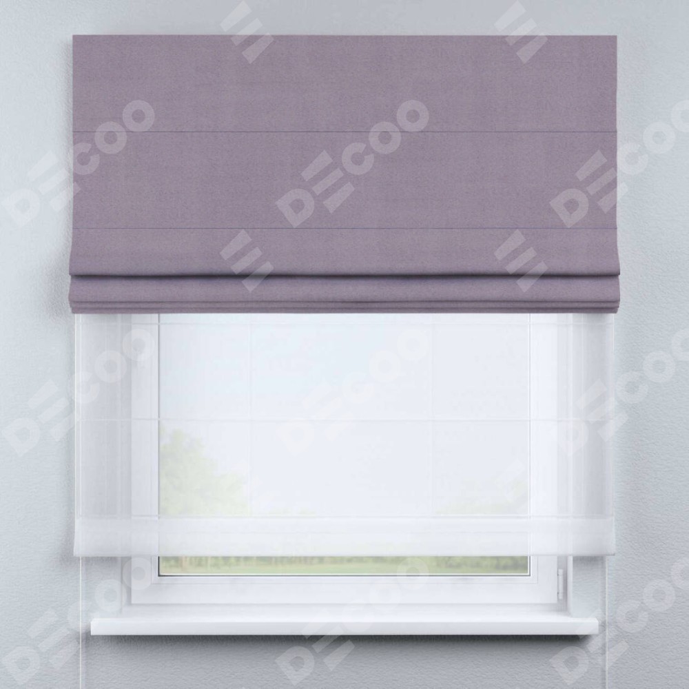 Двойная римская штора «День-ночь» от производителя Cortin предназначена для использования в проёмах. Эта штора уникальна тем, что состоит из двух полотен. На лицевой стороне находится однотонный блэкаут лиловый (артикул: 91577), обеспечивающий эффективное затемнение. В комплект также входит вторая ткань — легкий белый тюль (артикул: V-01), который добавляет изящества и легкости оформлению окна. Кроме того, доступны и другие разновидности ткани тюль, выбор которых доступен по  ссылке .