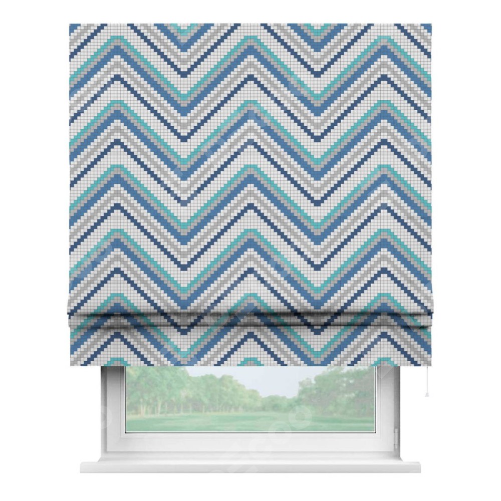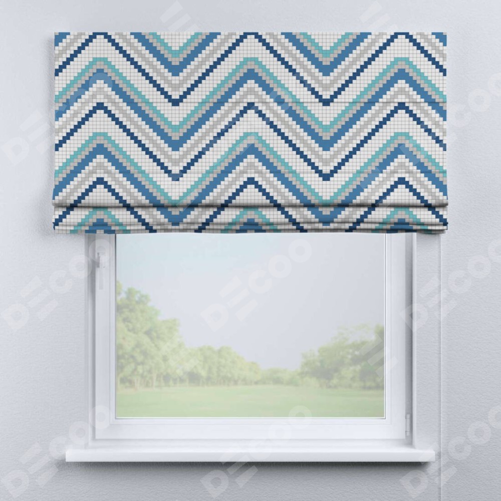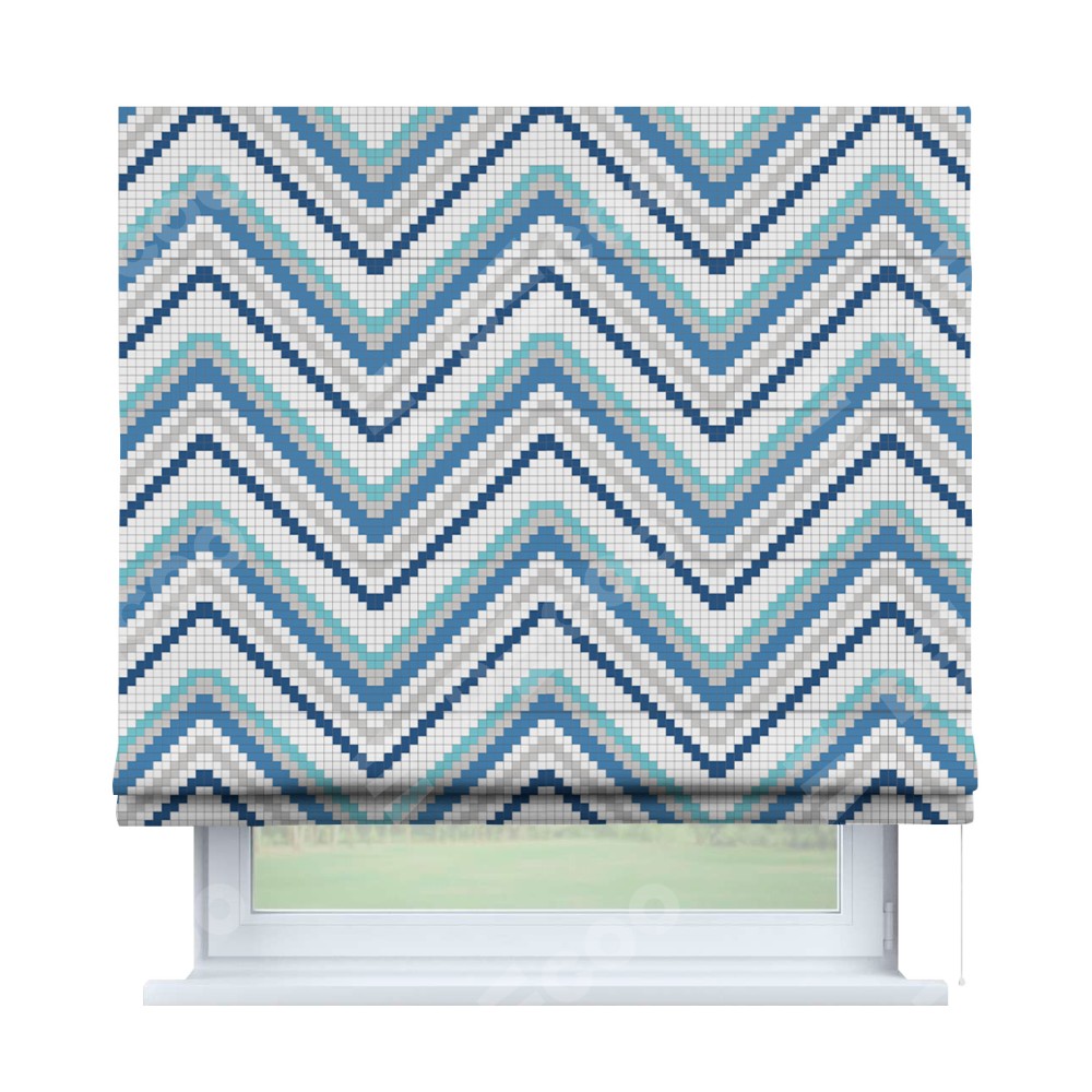 Классическая римская штора производителя «Cortin», пошита из ткани геометрическая волна, артикул:. Имеет универсальный механизм и подходит для монтажа: на потолок, на стену и в нишу.
