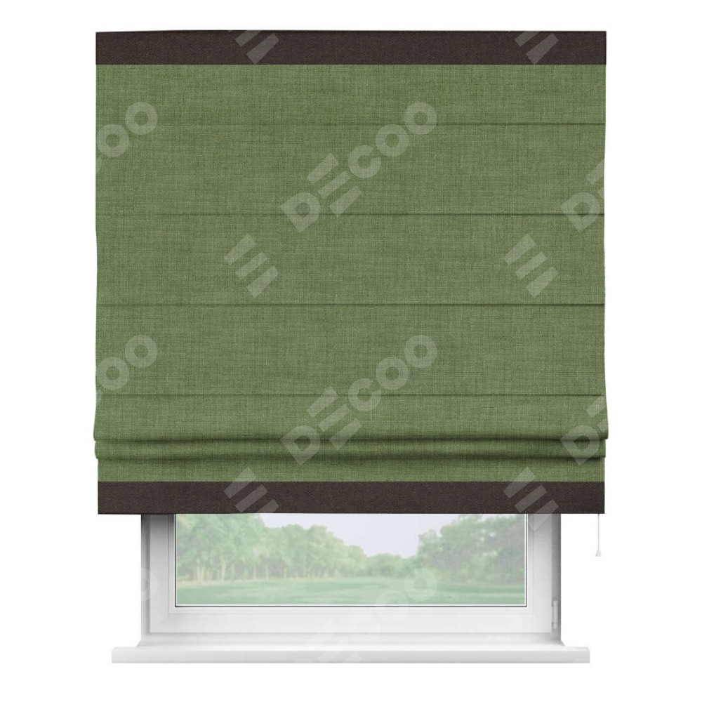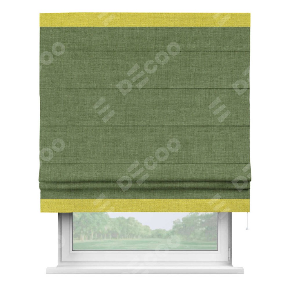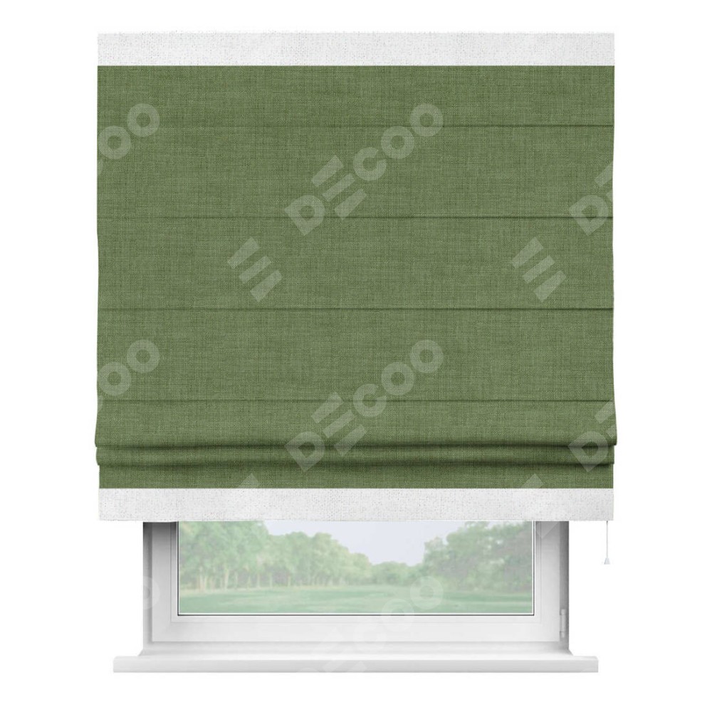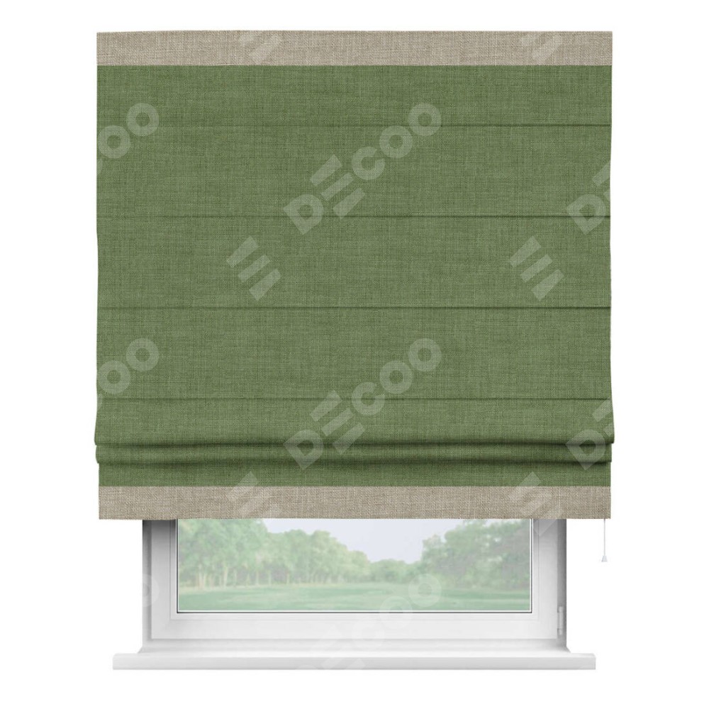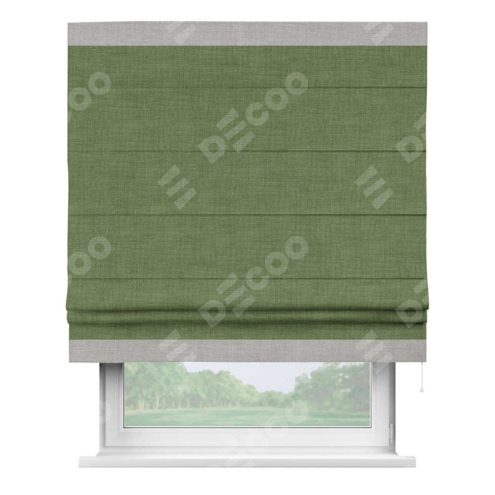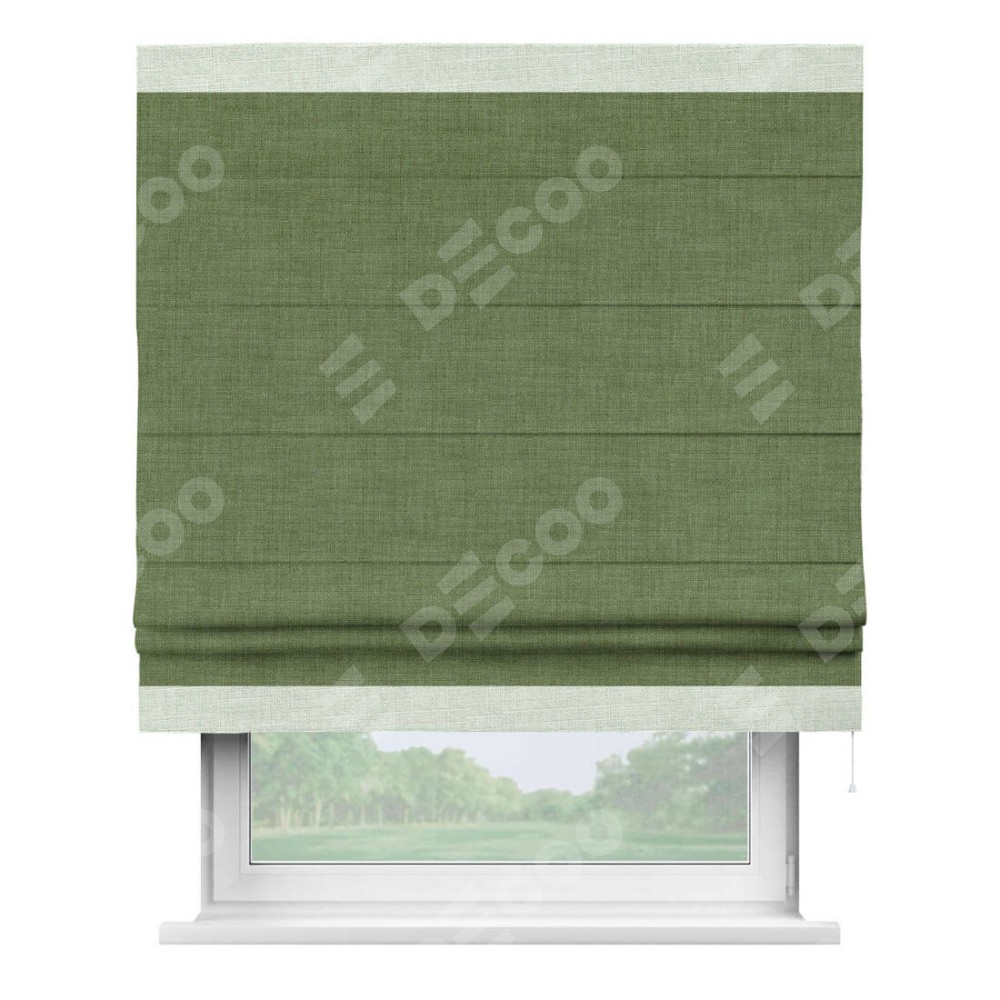 Классическая римская штора производителя «Cortin», пошита из ткани лён зелёный, артикул: 131547. Имеет универсальный механизм и подходит для монтажа: на потолок, на стену и в нишу.