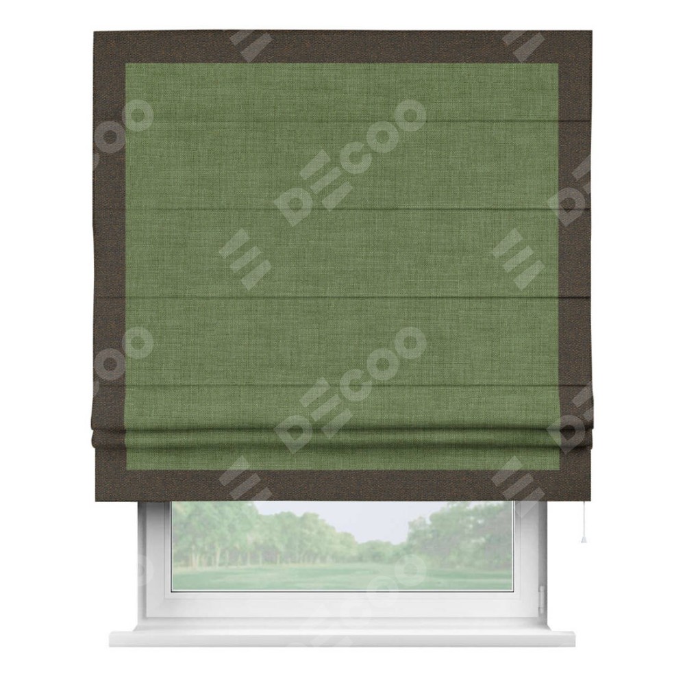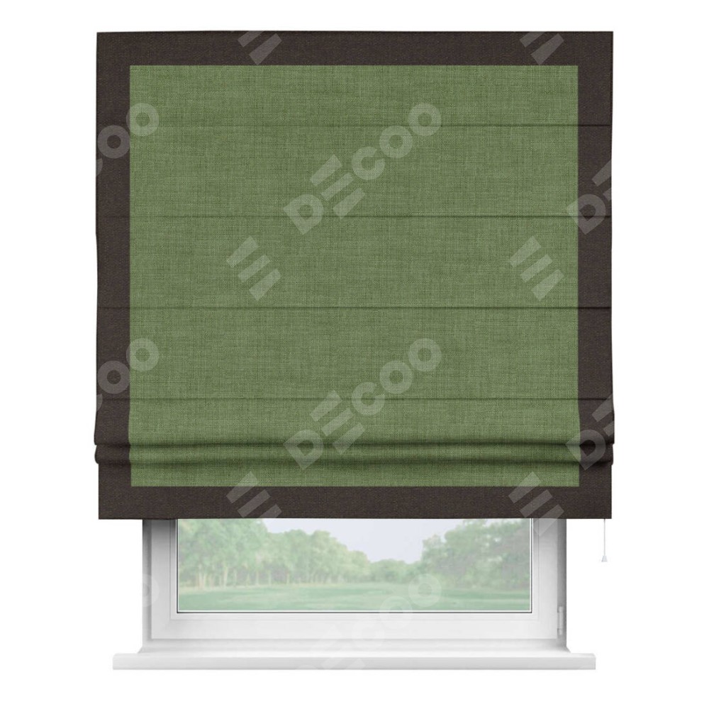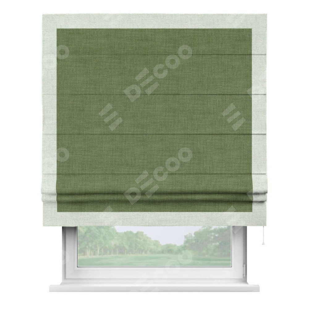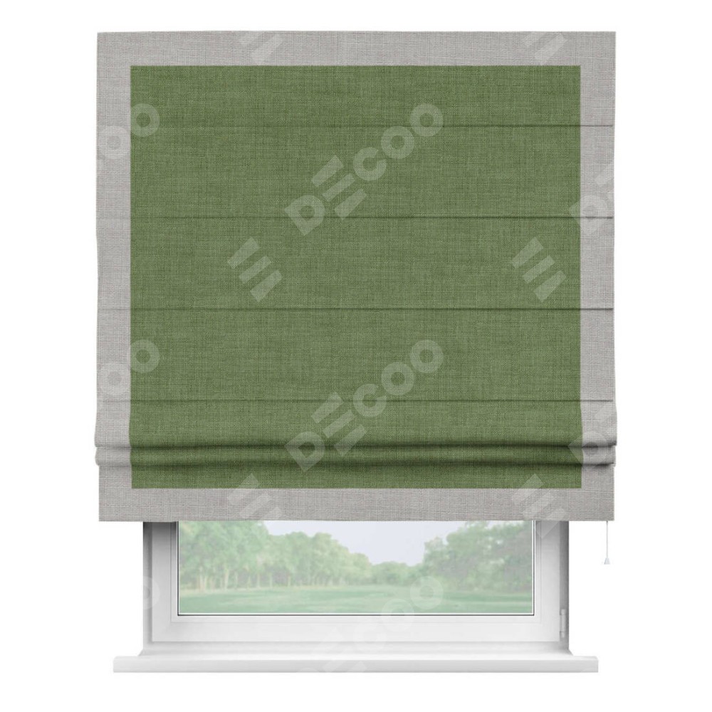 Классическая римская штора производителя «Cortin», пошита из ткани лён зелёный, артикул: 131547. Имеет универсальный механизм и подходит для монтажа: на потолок, на стену и в нишу.