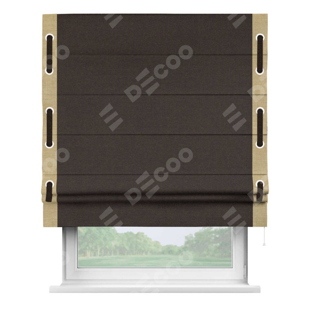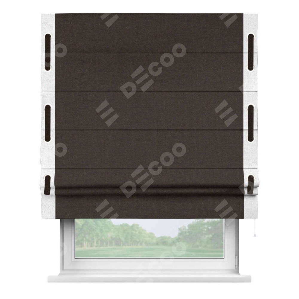 Классическая римская штора производителя «Cortin», пошита из ткани лён тёмно-коричневый, артикул: 104497. Имеет универсальный механизм и подходит для монтажа: на потолок, на стену и в нишу.