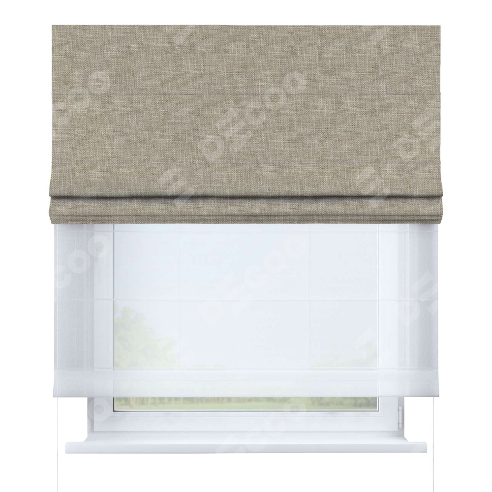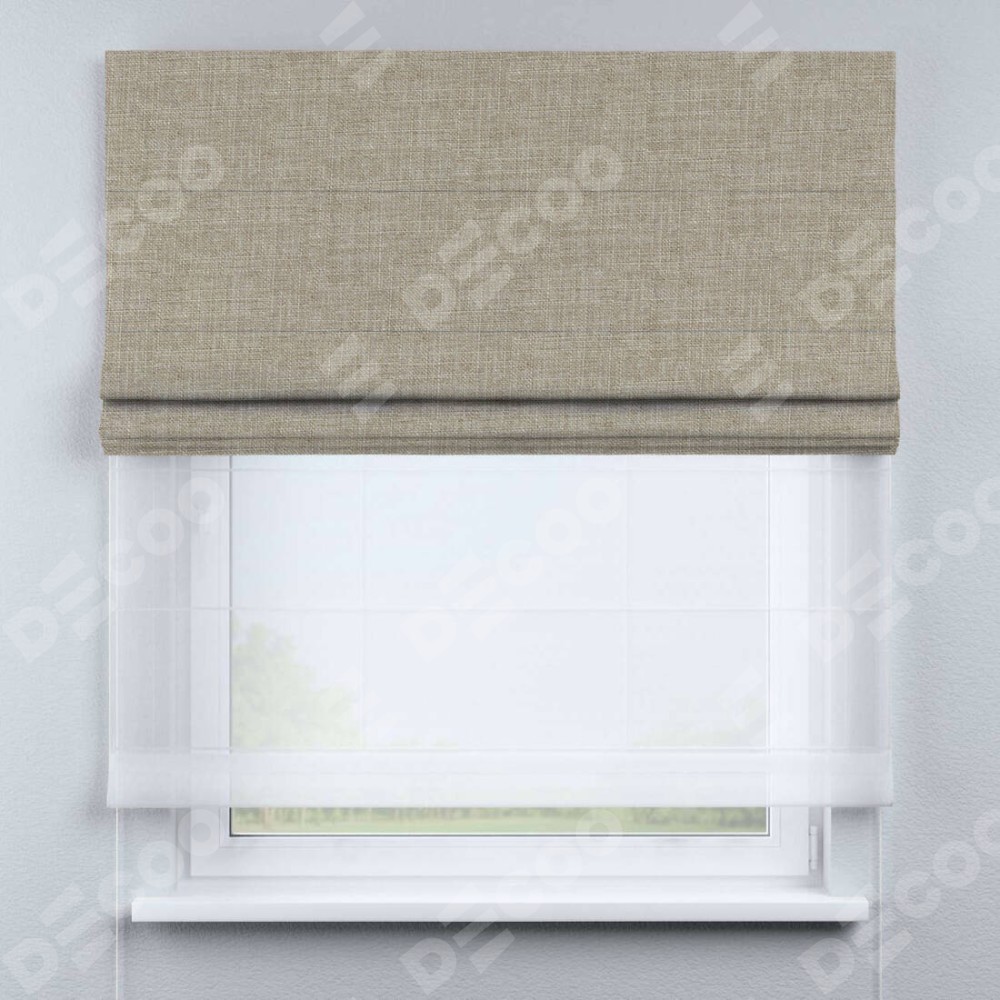 Двойная римская штора «День-ночь» от производителя Cortin предназначена для использования в проёмах. Эта штора уникальна тем, что состоит из двух полотен. На лицевой стороне находится лён бежевый (артикул: 143839), обеспечивающий эффективное затемнение. В комплект также входит вторая ткань — легкий белый тюль (артикул: V-01), который добавляет изящества и легкости оформлению окна. Кроме того, доступны и другие разновидности ткани тюль, выбор которых доступен по ссылке .