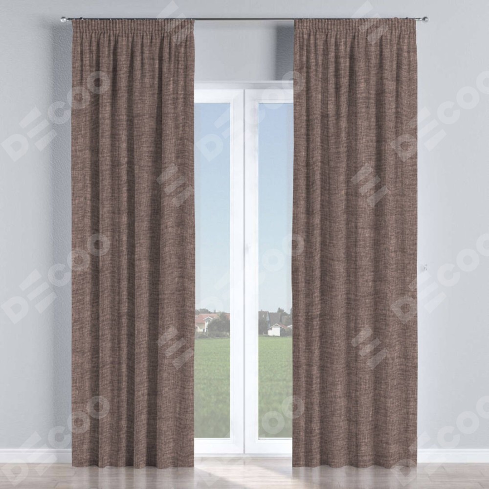 Готовые шторы от производителя «Cortin» представлены комплектом из двух одинаковых по размеру полотен, пошитых из ткани рогожка димаут коричневый, артикул ткани 80420. Такие шторы по сравнению с индивидуальным пошивом имеют ряд преимуществ: удобный размерный ряд под стандартные проёмы, стоимость и сроки (т.к. изделия всегда в наличии).