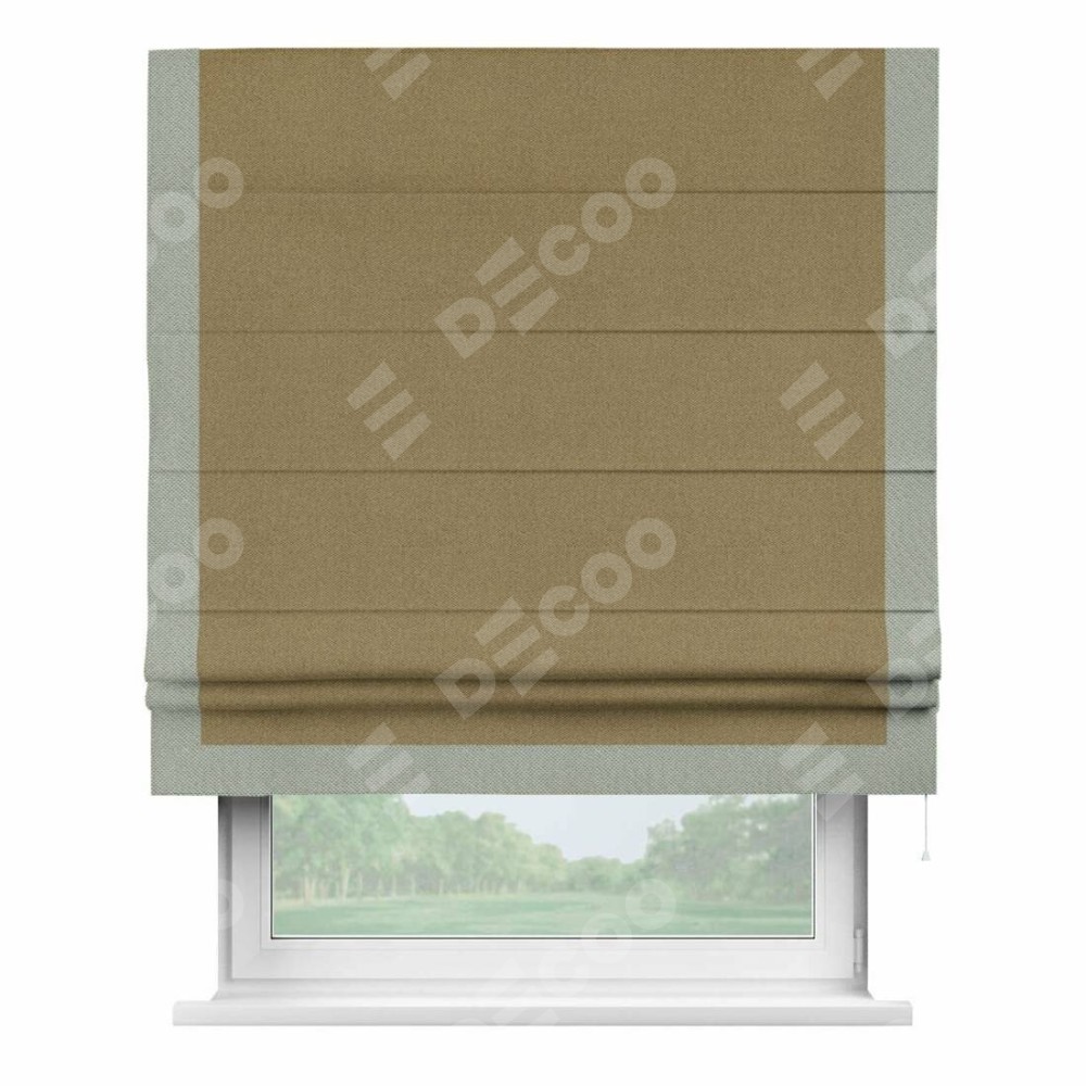 Римская штора производителя «Cortin», используется для проёма, пошита из ткани лён димаут оливковый, артикул 16243. Отделка шторы кантом «Виктория», ткань для канта используется из льна димаут разной расцветки на выбор. Имеет универсальный механизм и подходит для монтажа: на потолок, на стену и в нишу.