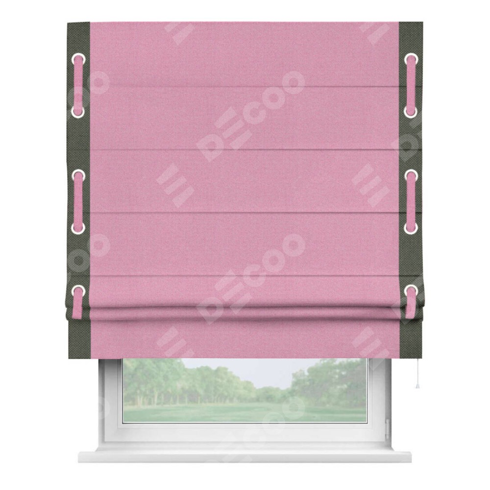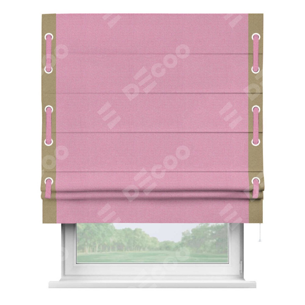 Римская штора производителя «Cortin», используется для проёма, пошита из ткани лён димаут розовый, артикул 16257. Отделка шторы кантом «Стрим Дуо» на кантах расположены люверсы с пояском, ткань для канта используется лён димаут разной расцветки на выбор. Ткань для пояска обычно используется из основной ткани шторы, а так же можно сделать из любой расцветки по желанию. Имеет универсальный механизм и подходит для монтажа: на потолок, на стену и в нишу.