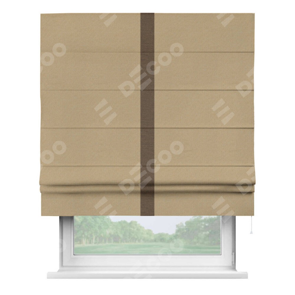 Римская штора производителя «Cortin», используется для проёма, пошита из ткани лён димаут тёмно-бежевый, артикул 83 037. Отделка шторы кантом «Хайвэй», ткань для канта используется из льна димаут разной расцветки на выбор. Имеет универсальный механизм и подходит для монтажа: на потолок, на стену и в нишу.