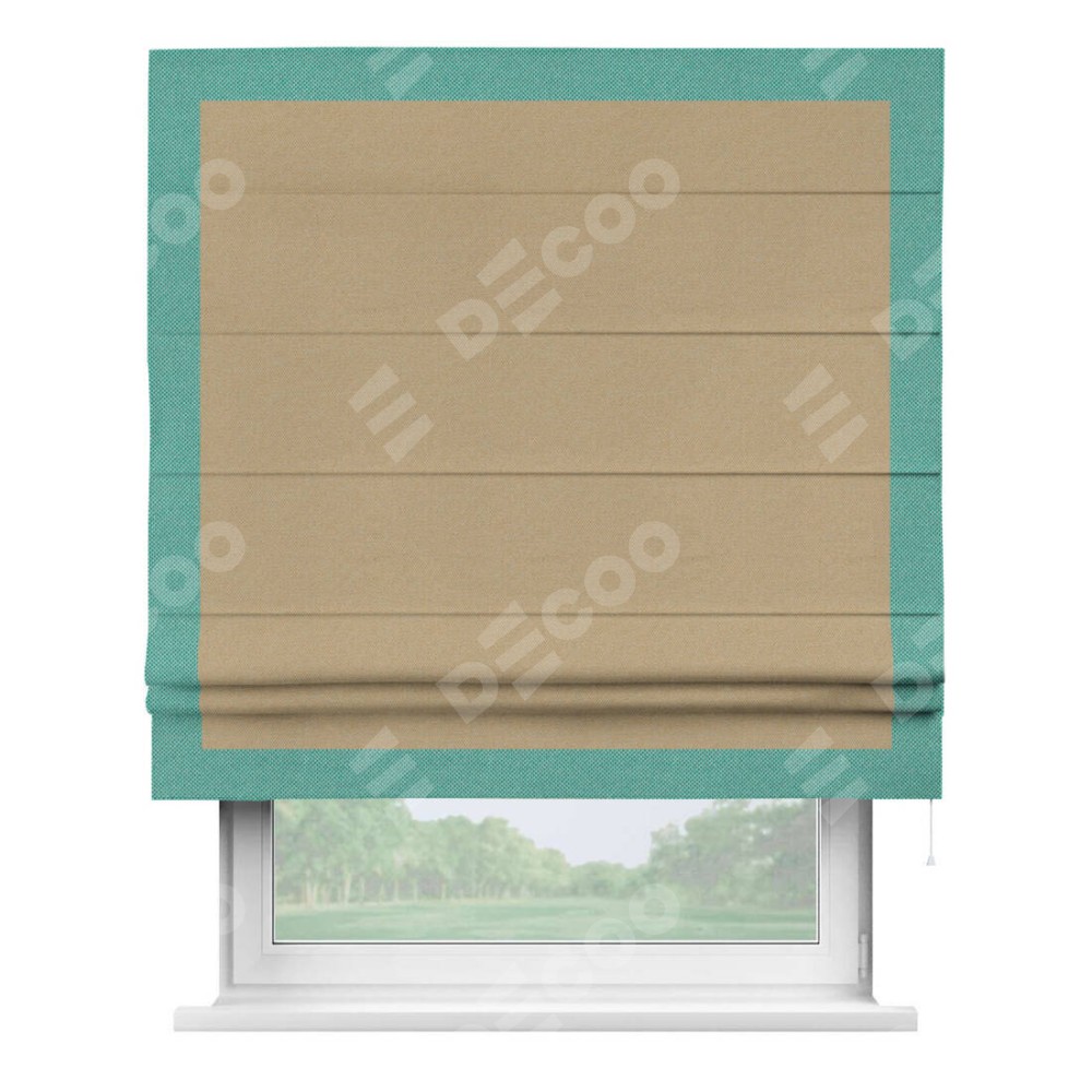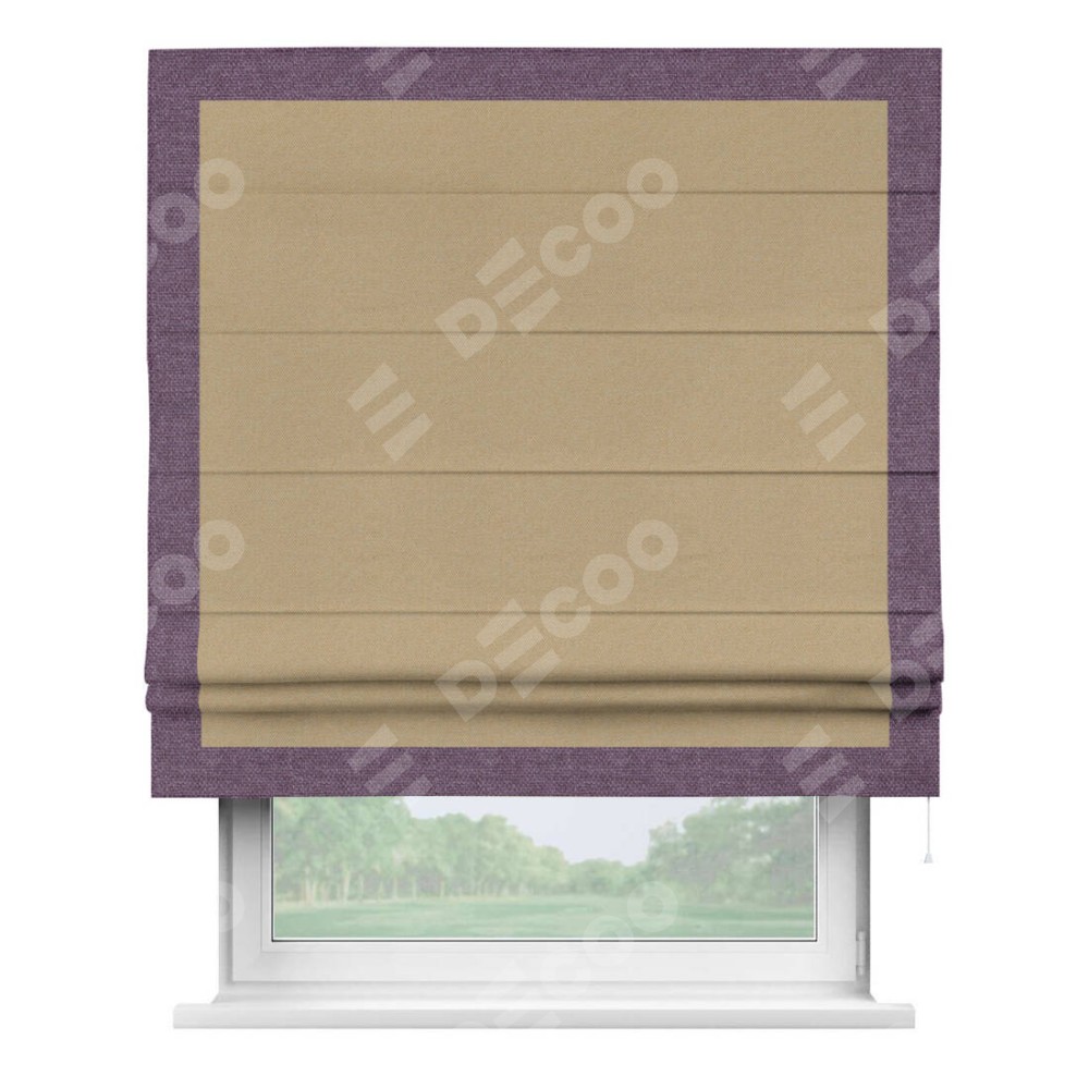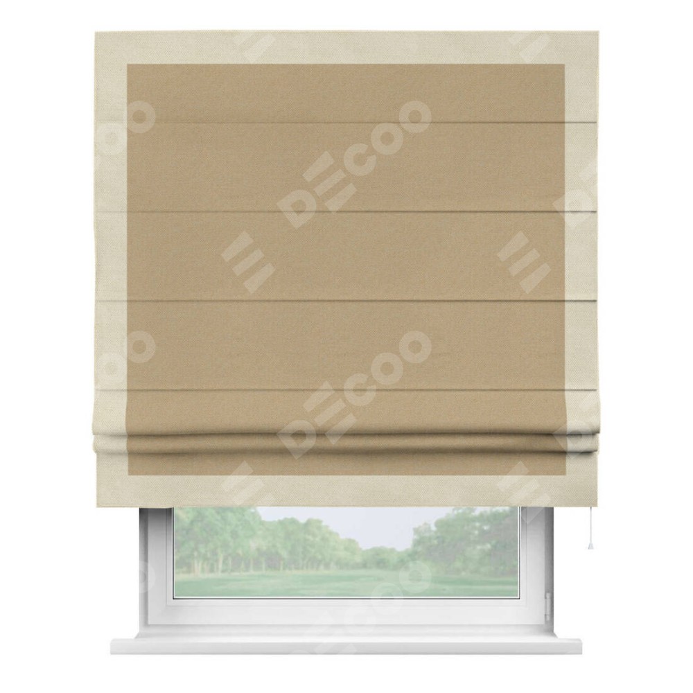Римская штора производителя «Cortin», используется для проёма, пошита из ткани лён димаут тёмно-бежевый, артикул 83037. Отделка шторы кантом «Чесс», ткань для канта используется из льна димаут разной расцветки на выбор. Имеет универсальный механизм и подходит для монтажа: на потолок, на стену и в нишу.