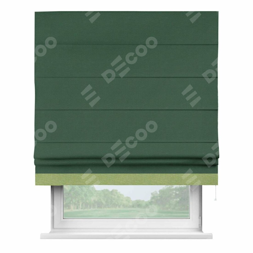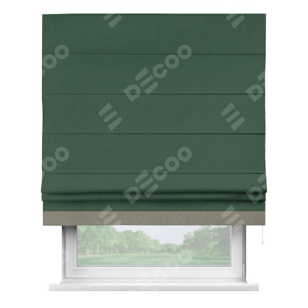 Римская штора производителя «Cortin», используется для проёма, пошита из ткани лён димаут тёмно-зелёный, артикул 16246. Отделка шторы кантом «Джестер», ткань для канта используется из льна димаут разной расцветки на выбор. Имеет универсальный механизм и подходит для монтажа: на потолок, на стену и в нишу.