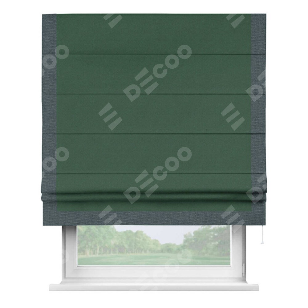 Римская штора производителя «Cortin», используется для проёма, пошита из ткани лён димаут тёмно-зелёный, артикул 16246. Отделка шторы кантом «Виктория», ткань для канта используется из льна димаут разной расцветки на выбор. Имеет универсальный механизм и подходит для монтажа: на потолок, на стену и в нишу.