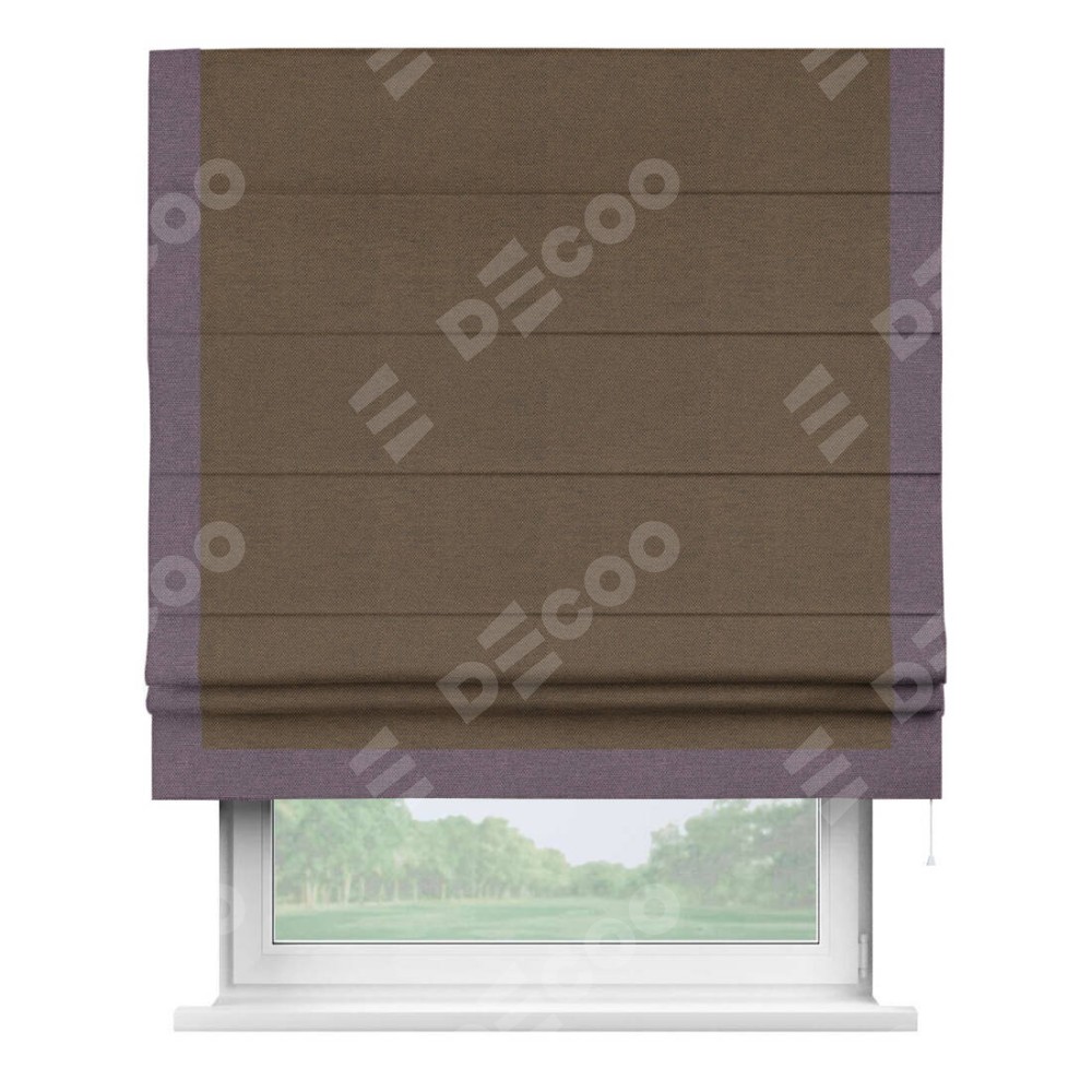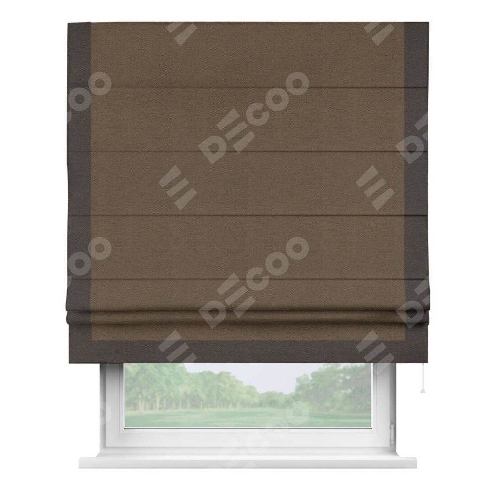 Римская штора производителя «Cortin», используется для проёма, пошита из ткани лён димаут тёмно-коричневый, артикул 83030. Отделка шторы кантом «Виктория», ткань для канта используется из льна димаут разной расцветки на выбор. Имеет универсальный механизм и подходит для монтажа: на потолок, на стену и в нишу.