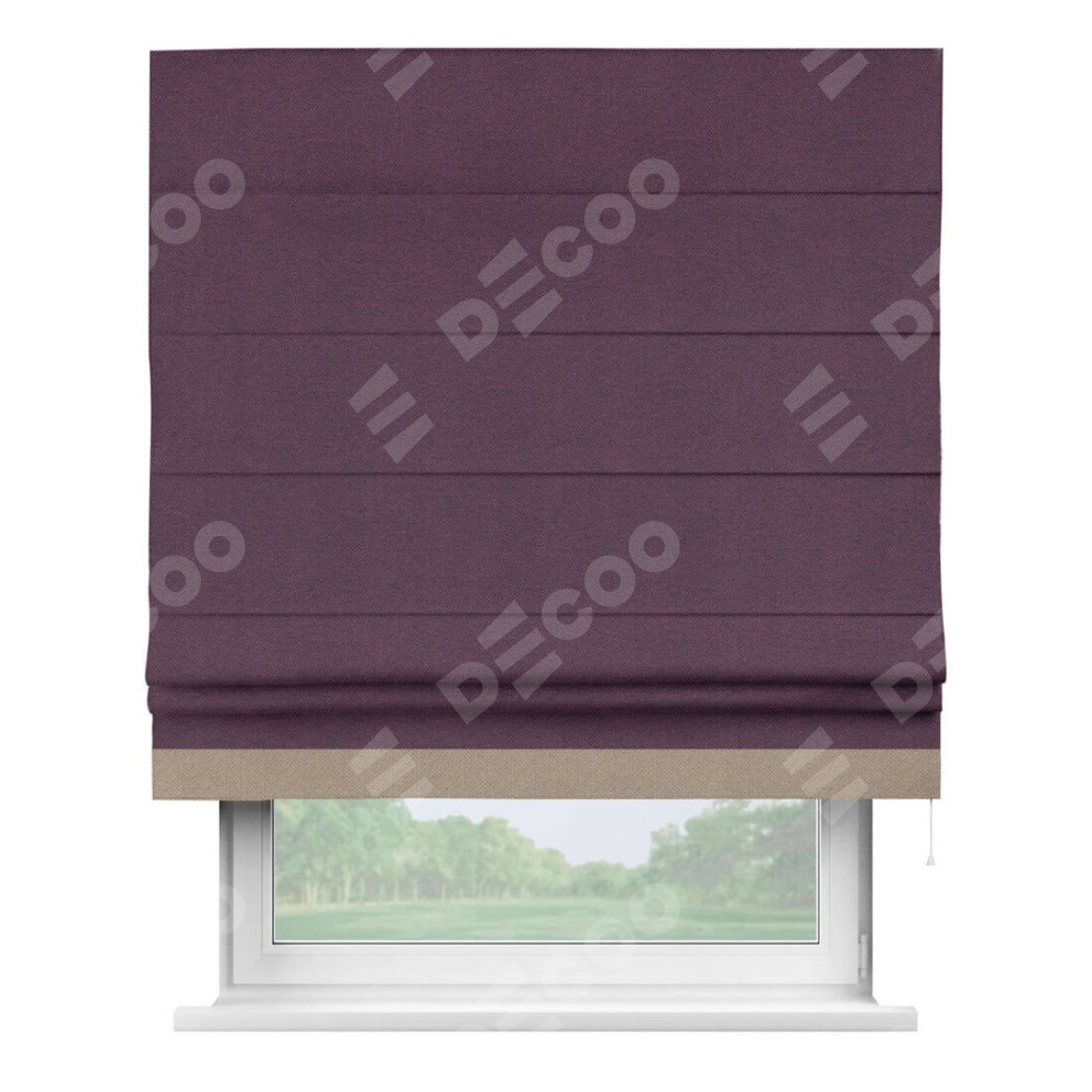 Римская штора производителя «Cortin», используется для проёма, пошита из ткани лён димаут фиолетовый, артикул 8817. Отделка шторы кантом «Джестер», ткань для канта используется из льна димаут разной расцветки на выбор. Имеет универсальный механизм и подходит для монтажа: на потолок, на стену и в нишу.
