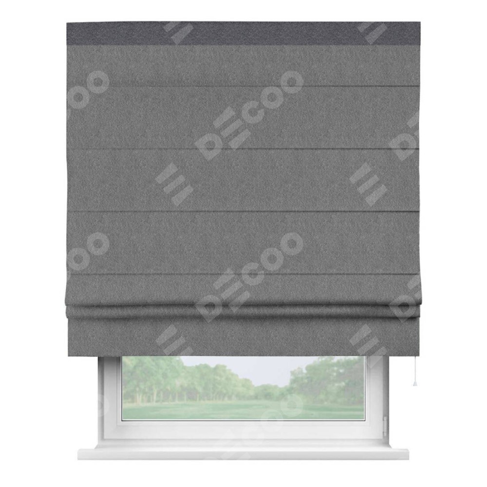 Римская штора производителя «Cortin», используется для проёма, пошита из ткани софт однотонный серый, артикул 70605. Отделка шторы кантом «Кинг», ткань для канта используется из софта разной расцветки на выбор. Имеет универсальный механизм и подходит для монтажа: на потолок, на стену и в нишу.