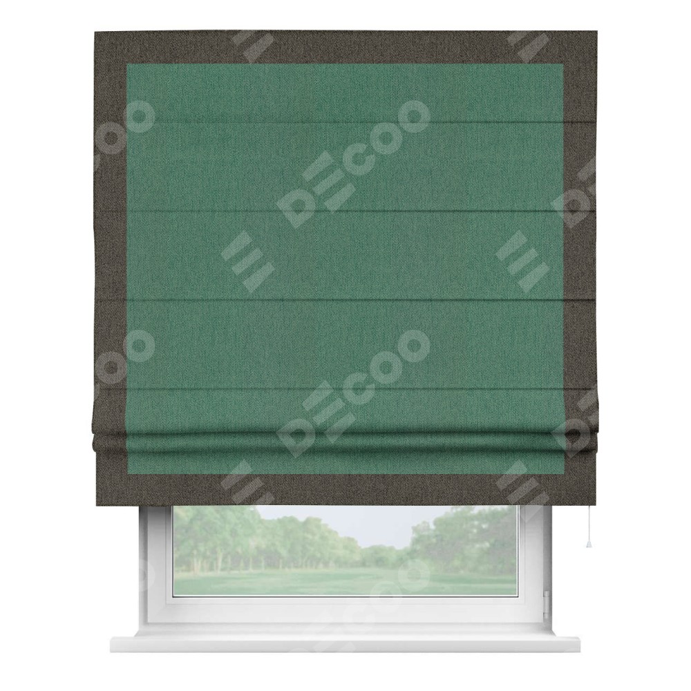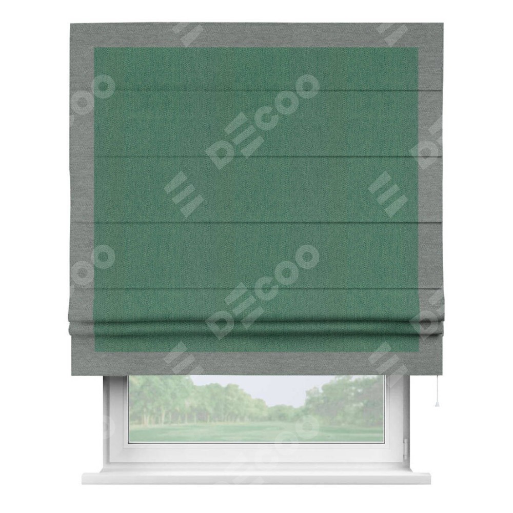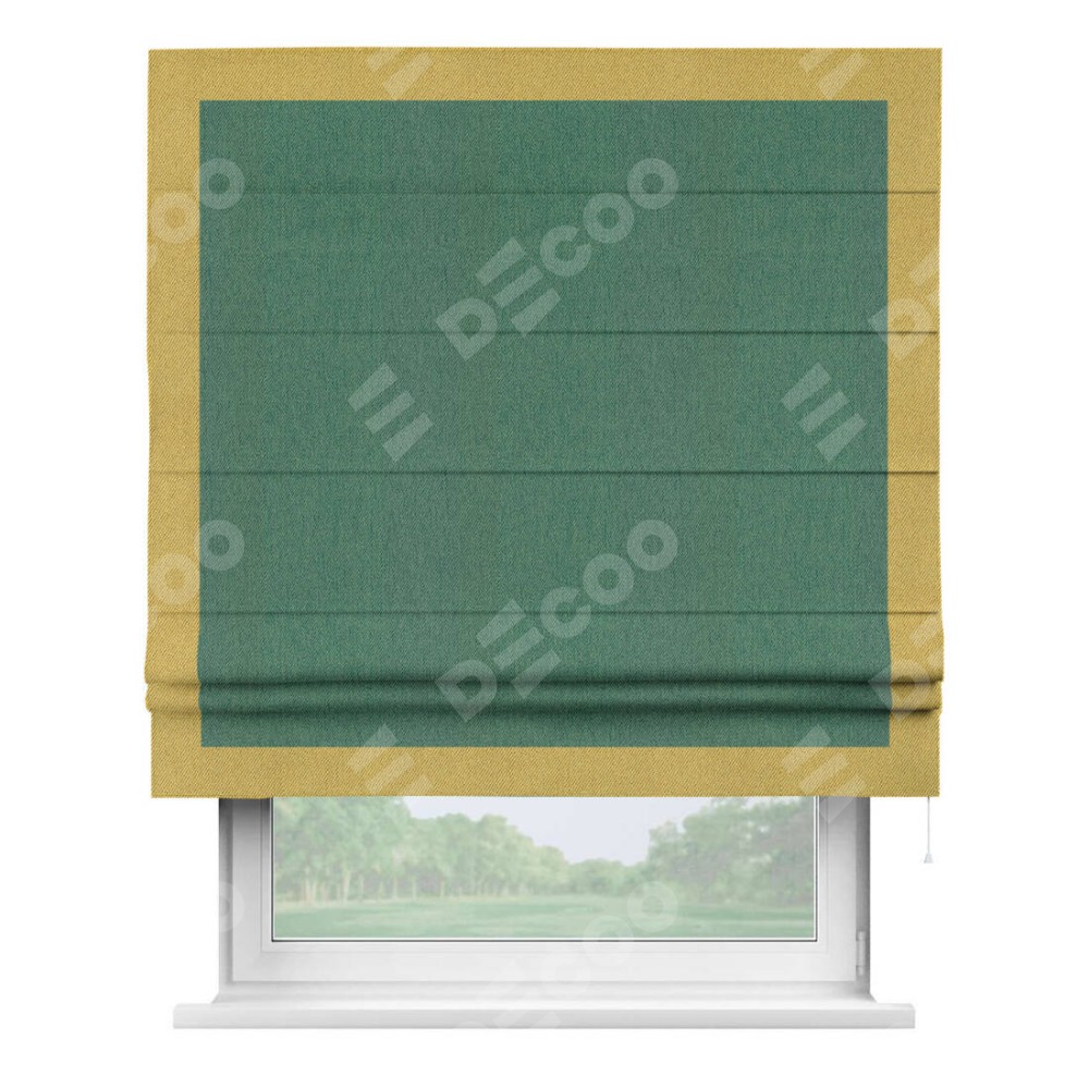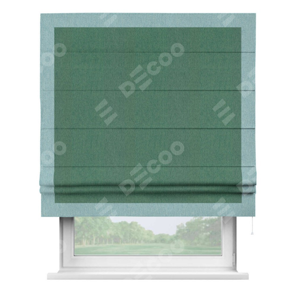 Римская штора производителя «Cortin», используется для проёма, пошита из ткани твид блэкаут зелёный, артикул 21589. Отделка шторы кантом «Чесс», ткань для канта используется из твида разной расцветки на выбор. Имеет универсальный механизм и подходит для монтажа: на потолок, на стену и в нишу.