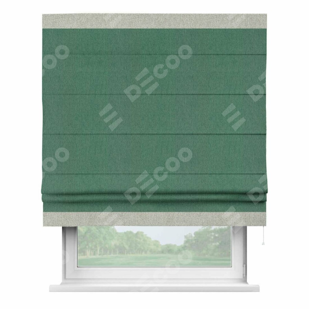 Римская штора производителя «Cortin», используется для проёма, пошита из ткани твид блэкаут зелёный, артикул 21589. Отделка шторы кантом «Горизонт», ткань для канта используется из твида разной расцветки на выбор. Имеет универсальный механизм и подходит для монтажа: на потолок, на стену и в нишу.