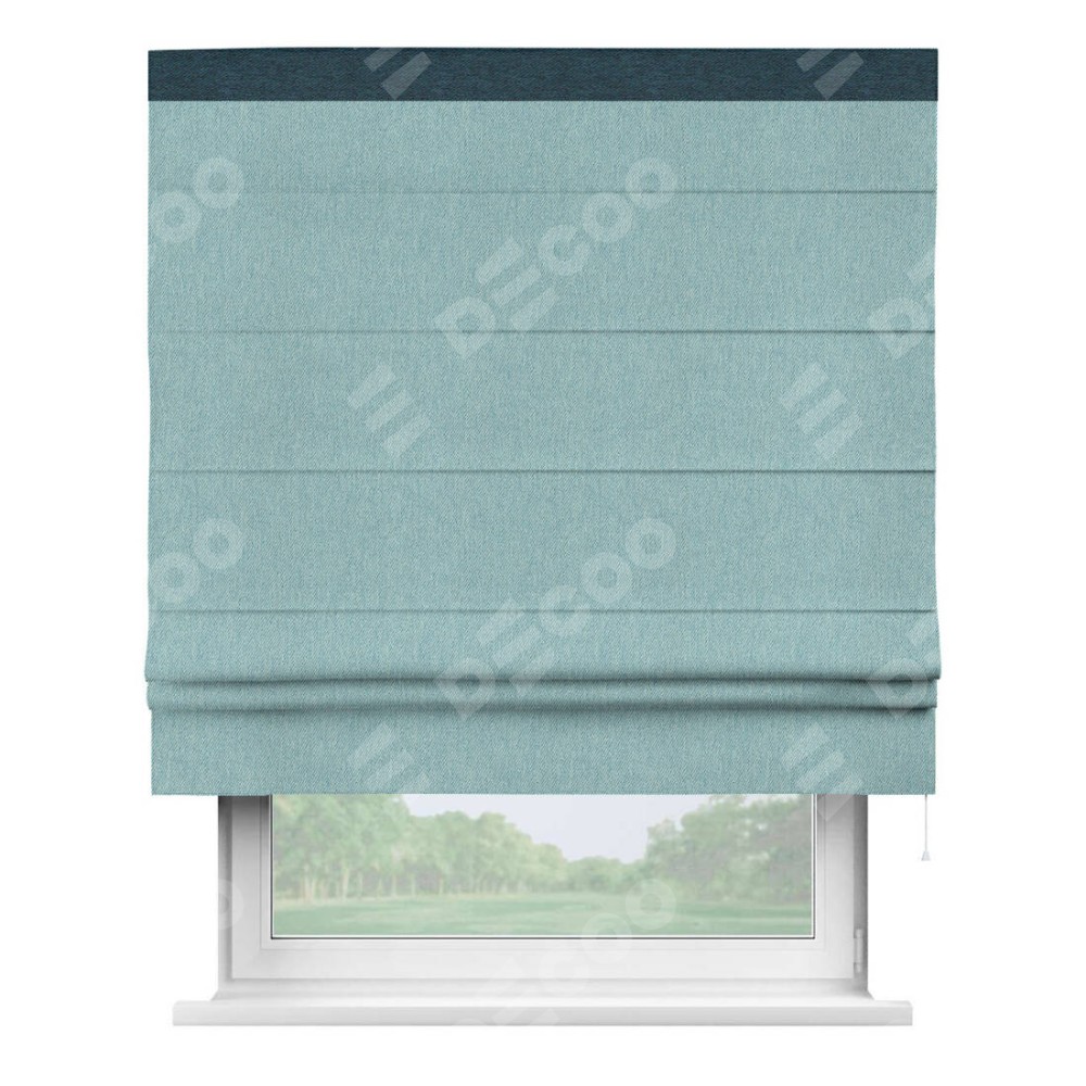 Римская штора производителя «Cortin», используется для проёма, пошита из ткани твид блэкаут небесно-голубой, артикул 21578. Отделка шторы кантом «Кинг», ткань для канта используется из твида разной расцветки на выбор. Имеет универсальный механизм и подходит для монтажа: на потолок, на стену и в нишу.