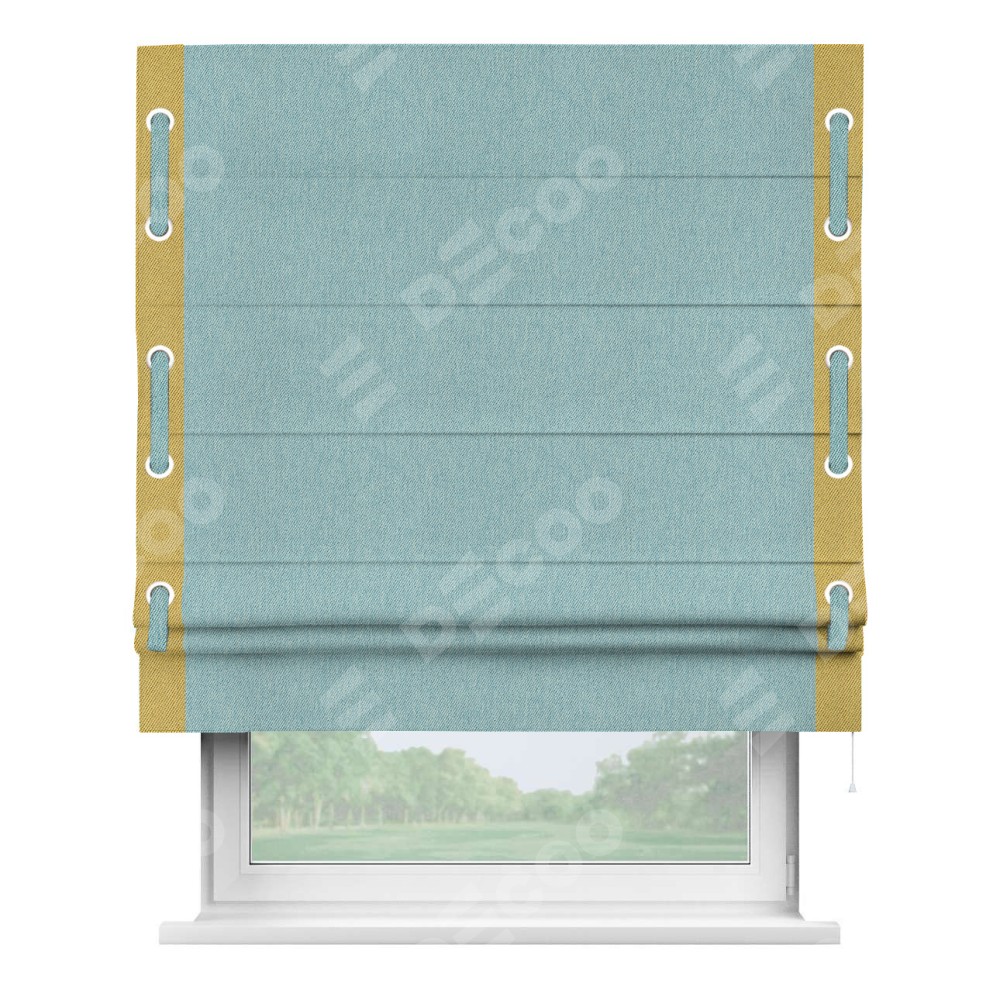 Римская штора производителя «Cortin», используется для проёма, пошита из ткани твид блэкаут небесно-голубой, артикул 21578. Отделка шторы кантом «Стрим Дуо» на кантах расположены люверсы с пояском, ткань для канта используется из твида разной расцветки на выбор. Ткань для пояска обычно используется из основной ткани шторы, а так же можно сделать из любой расцветки по желанию. Имеет универсальный механизм и подходит для монтажа: на потолок, на стену и в нишу.