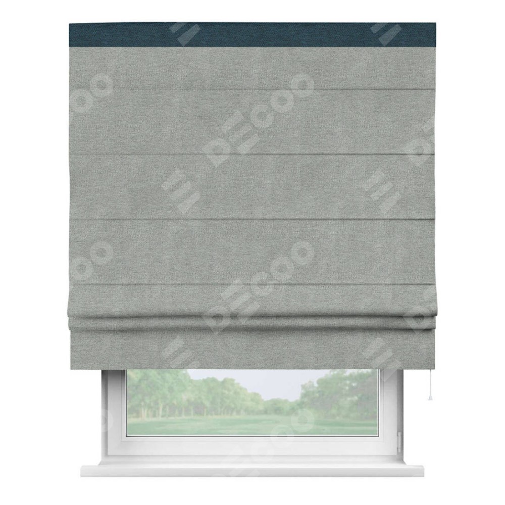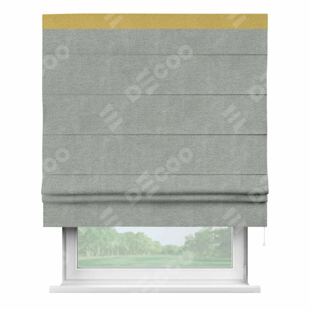 Римская штора производителя «Cortin», используется для проёма, пошита из ткани твид блэкаут светло-серый, артикул 21576. Отделка шторы кантом «Кинг», ткань для канта используется из твида разной расцветки на выбор. Имеет универсальный механизм и подходит для монтажа: на потолок, на стену и в нишу.