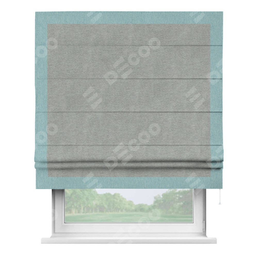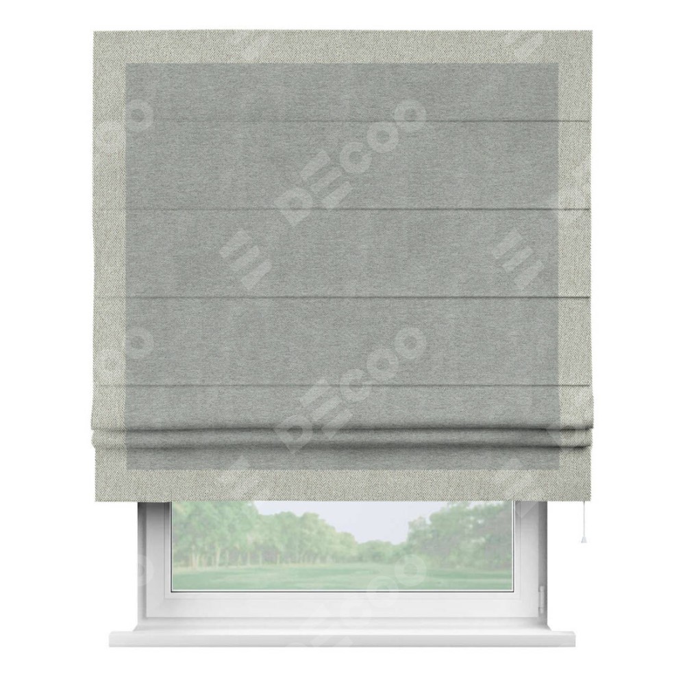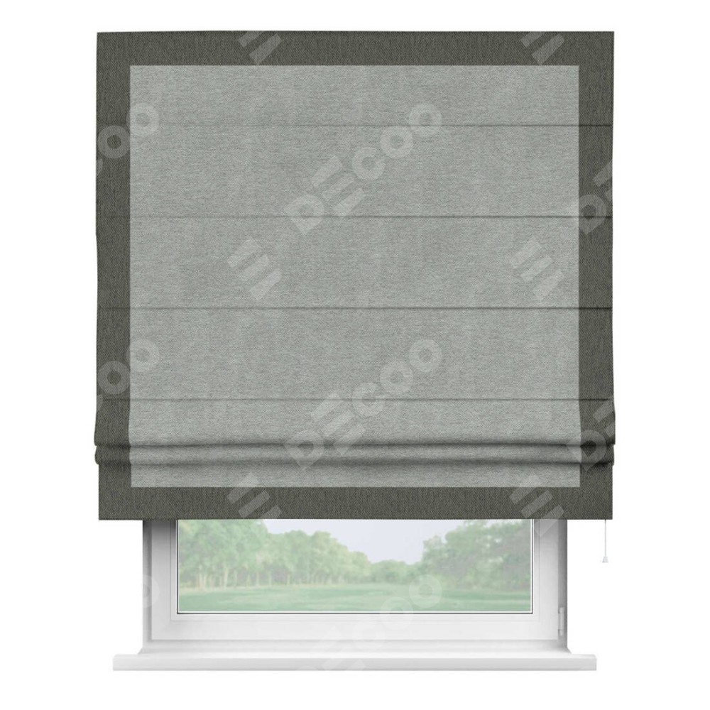 Римская штора производителя «Cortin», используется для проёма, пошита из ткани твид блэкаут светло-серый, артикул 21576. Отделка шторы кантом «Чесс», ткань для канта используется из твида разной расцветки на выбор. Имеет универсальный механизм и подходит для монтажа: на потолок, на стену и в нишу.