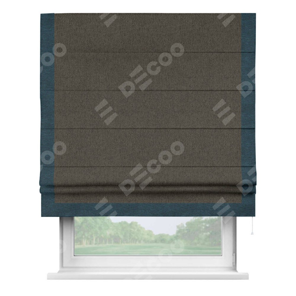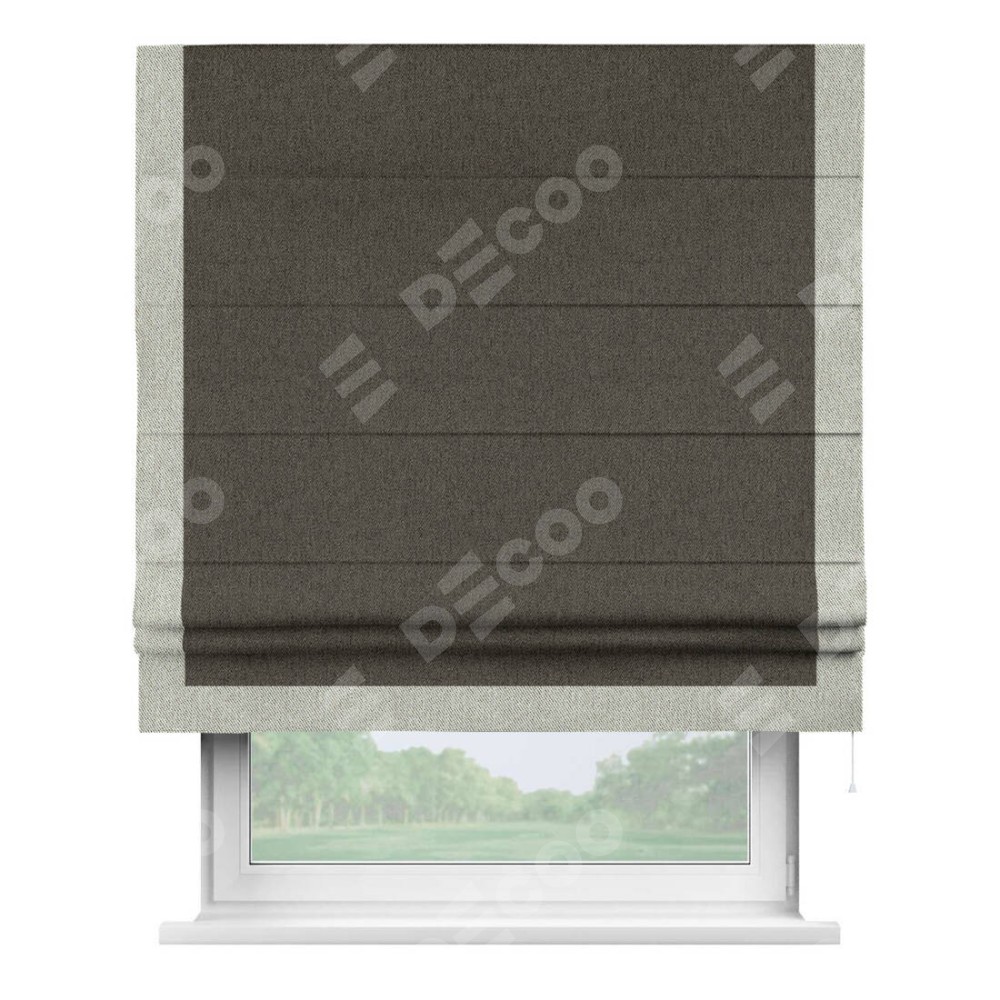Римская штора производителя «Cortin», используется для проёма, пошита из ткани твид блэкаут тёмно-коричневый, артикул 21584. Отделка шторы кантом «Виктория», ткань для канта используется из твида разной расцветки на выбор. Имеет универсальный механизм и подходит для монтажа: на потолок, на стену и в нишу.