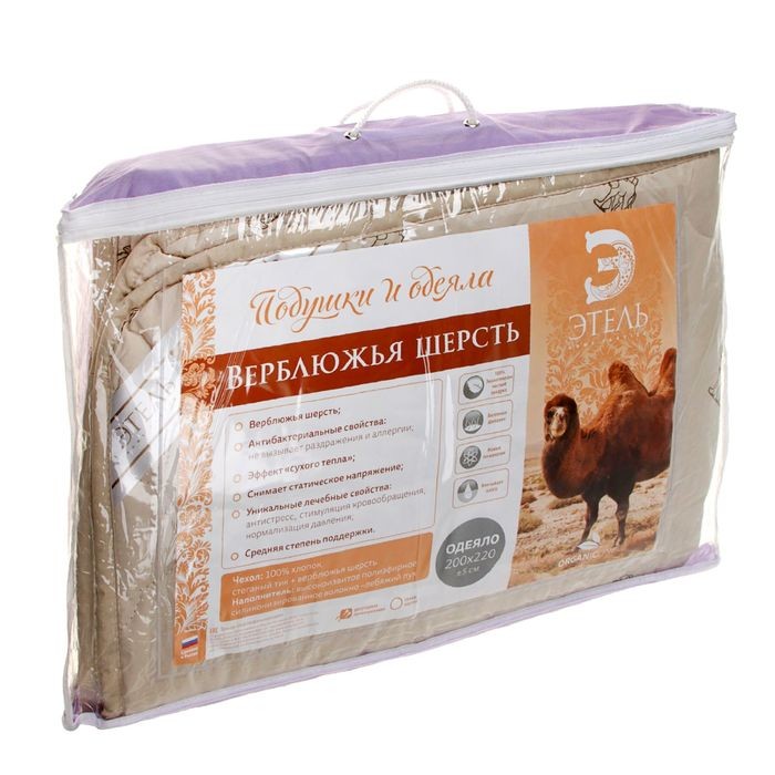 Утеплитель: верблюжья шерсть 50%, лебяжий пух (высокоизвитое полиэфирное силиконизированное волокно) 50%, плотность наполнителя 300 г/м².