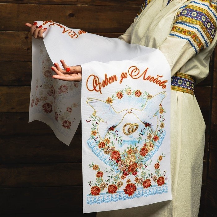 Рушник под ноги. Кто первым из молодых на него встанет — тому и быть хозяином в доме. Лучше отказаться от вариантов, на которых изображена пара голубей или лебедей, а также кольца. Считается, что супруги могут затоптать своё счастье. Лучше отдать предпочтение геометрическим или растительным узорам.
