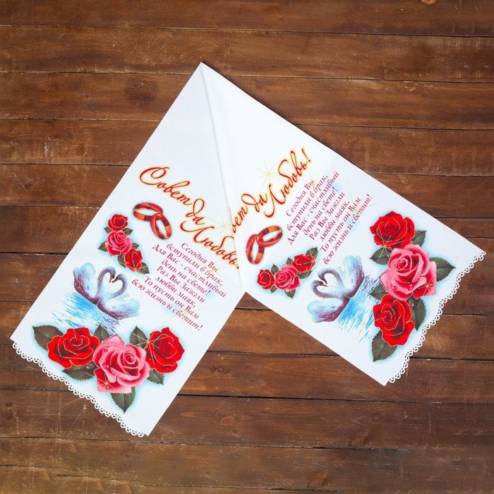Рушник под ноги. Кто первым из молодых на него встанет — тому и быть хозяином в доме. Лучше отказаться от вариантов, на которых изображена пара голубей или лебедей, а также кольца. Считается, что супруги могут затоптать своё счастье. Лучше отдать предпочтение геометрическим или растительным узорам.