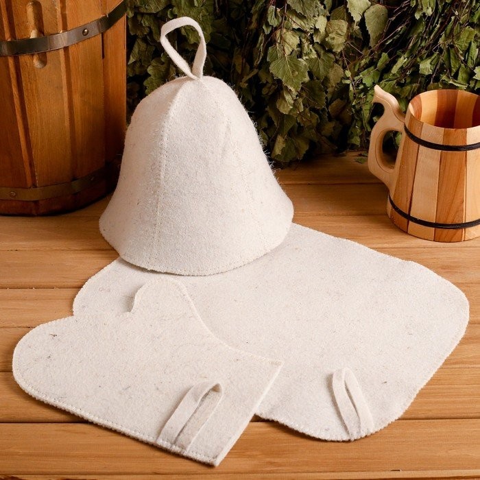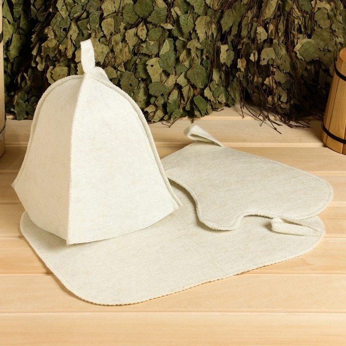 Для комфортного отдыха в парной возьмите с собой набор банных принадлежностей. Предметы из этого комплекта предохраняют тело от перегрева и являются средствами индивидуального пользования. Влажные изделия рекомендуется сушить в расправленном виде на горизонтальной поверхности. Принадлежности из войлока и фетра стирайте вручную при температуре воды 30 °C.