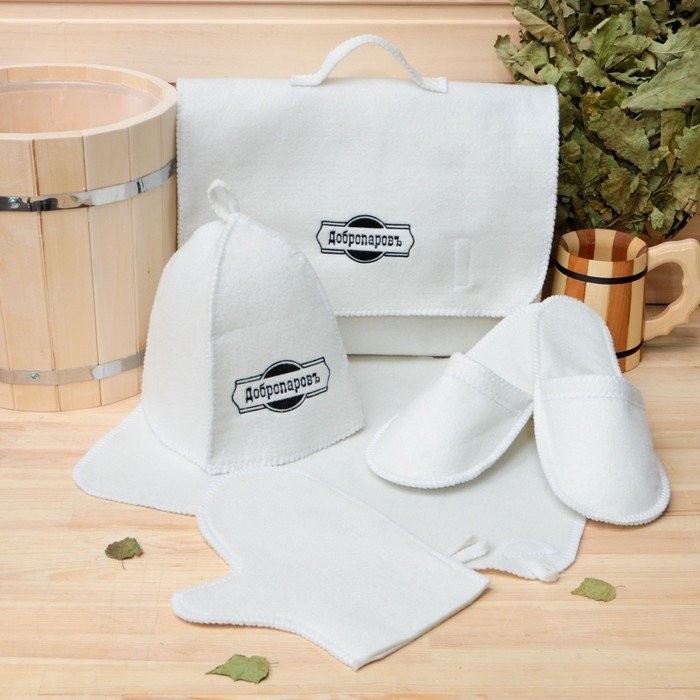 Для комфортного отдыха в парной возьмите с собой набор банных принадлежностей. Предметы из этого комплекта предохраняют тело от перегрева и являются средствами индивидуального пользования. Влажные изделия рекомендуется сушить в расправленном виде на горизонтальной поверхности. Принадлежности из войлока и фетра стирайте вручную при температуре воды 30 °C.