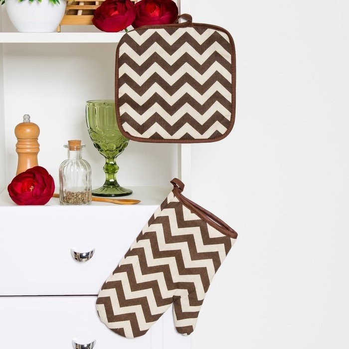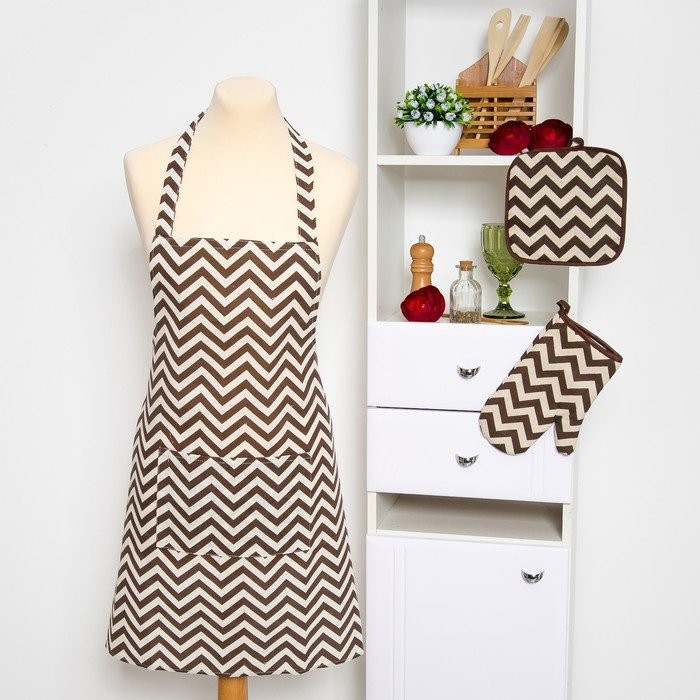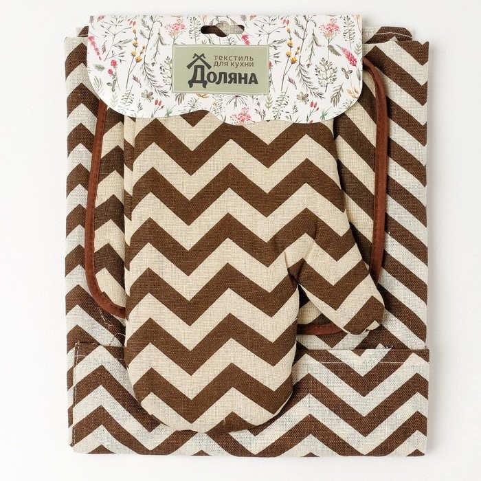 Набор Доляна фартук/прихватка/варежка, Зигзаг коричневый, 100%пэ, рогожка 200 гр/м