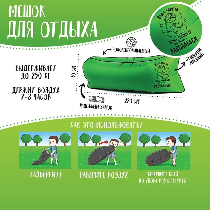 - Благодаря водостойкости удобно использовать вместо пляжного надувного матраса, ведь надувной мешок превосходно держится на воде