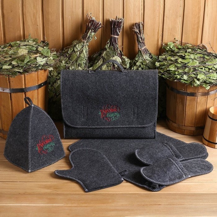 Для комфортного отдыха в парной возьмите с собой набор банных принадлежностей. Предметы из этого комплекта предохраняют тело от перегрева и являются средствами индивидуального пользования. Влажные изделия рекомендуется сушить в расправленном виде на горизонтальной поверхности. Принадлежности из войлока и фетра стирайте вручную при температуре воды 30 °C.