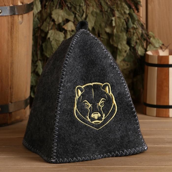 Шапка для бани серая с вышивкой «Медведь»