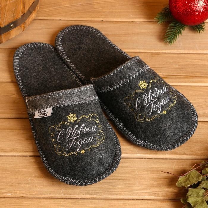 Тапочки банные серые с вышивкой «С Новым Годом (вензель)»