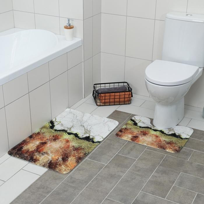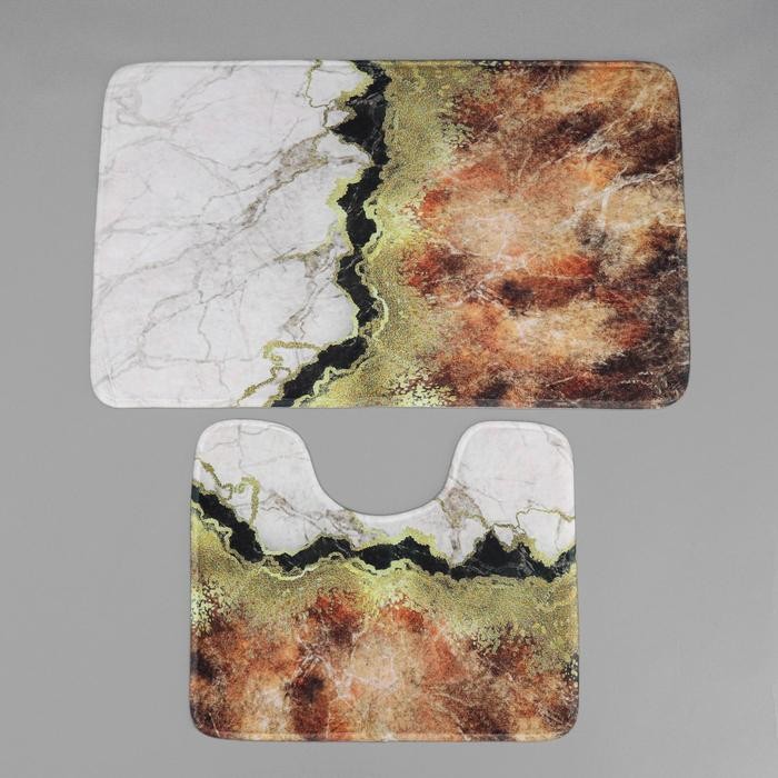 Набор ковриков для ванны и туалета Доляна «Мрамор», 2 шт: 79×50, 50×39 см, цвет коричнево-белый